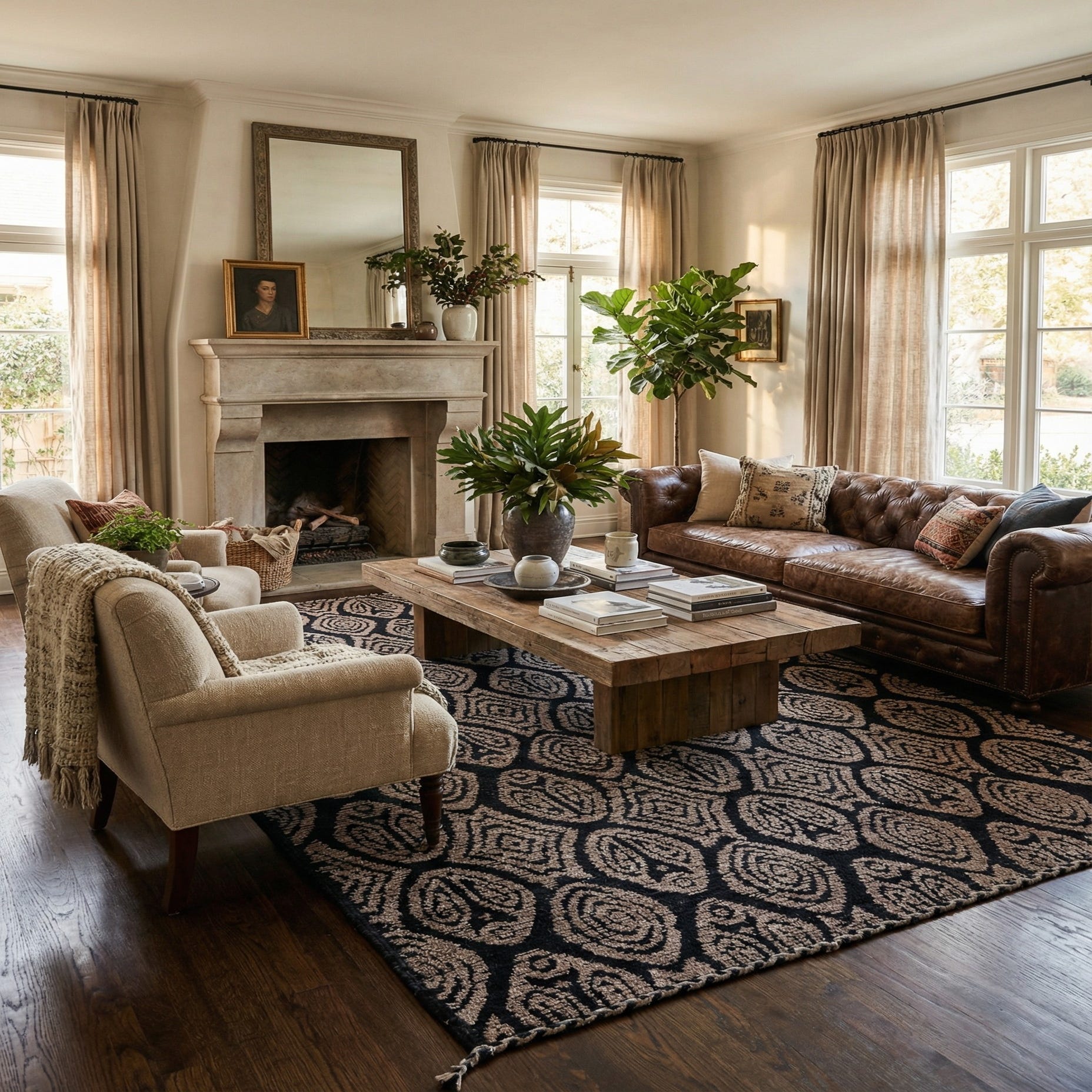 Primary color is Black. Colors in this rug include: Black, Brown.