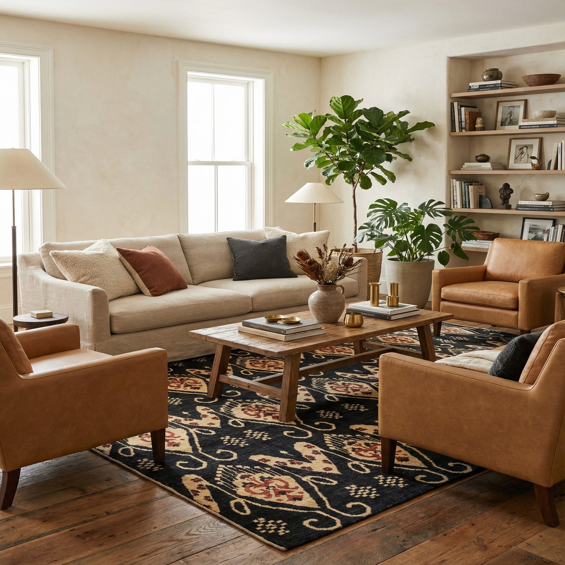 Primary color is Black. Colors in this rug include: Black, Cream, Gray, Terracotta, Beige, Olive.