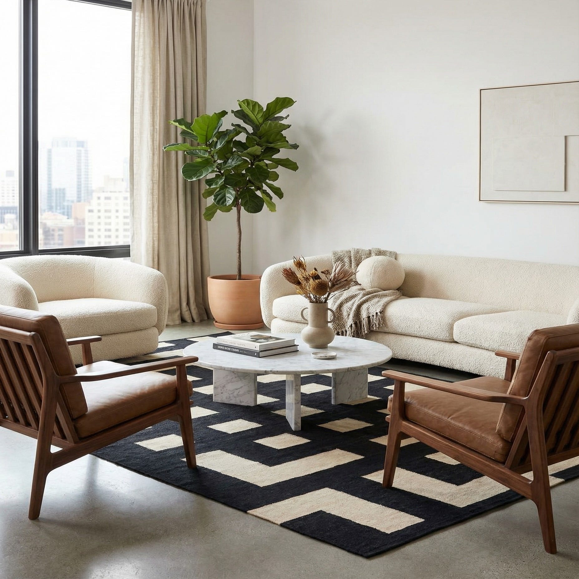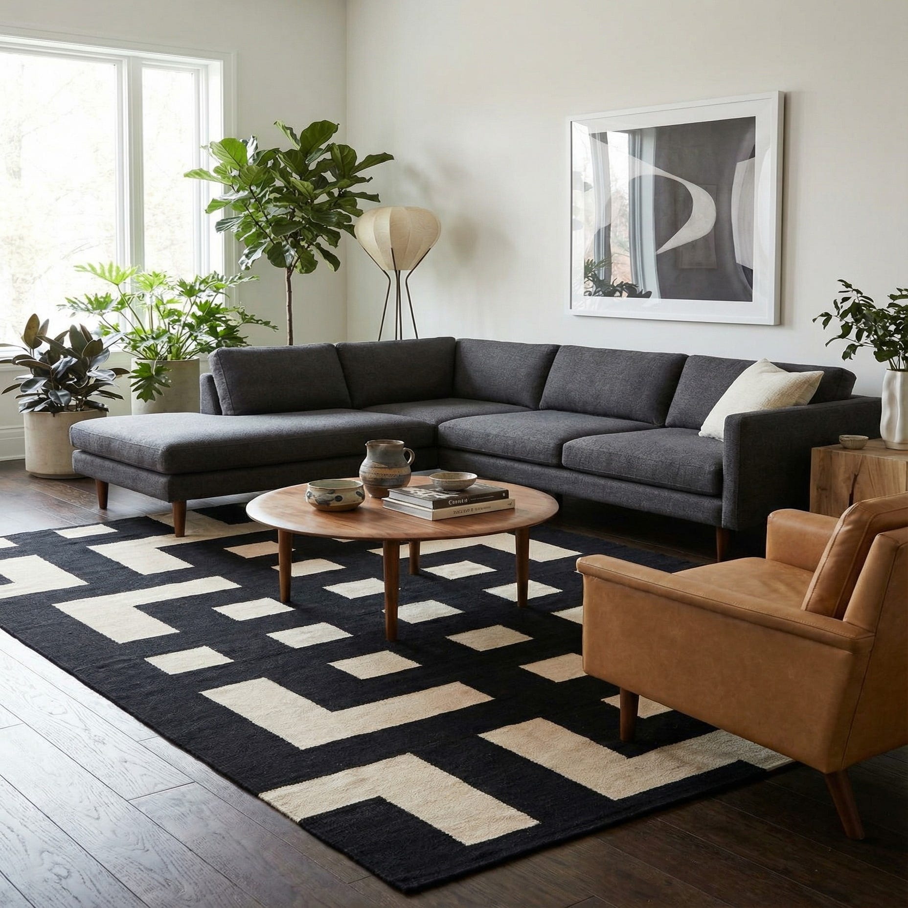 Primary color is Black. Colors in this rug include: Black, Cream.