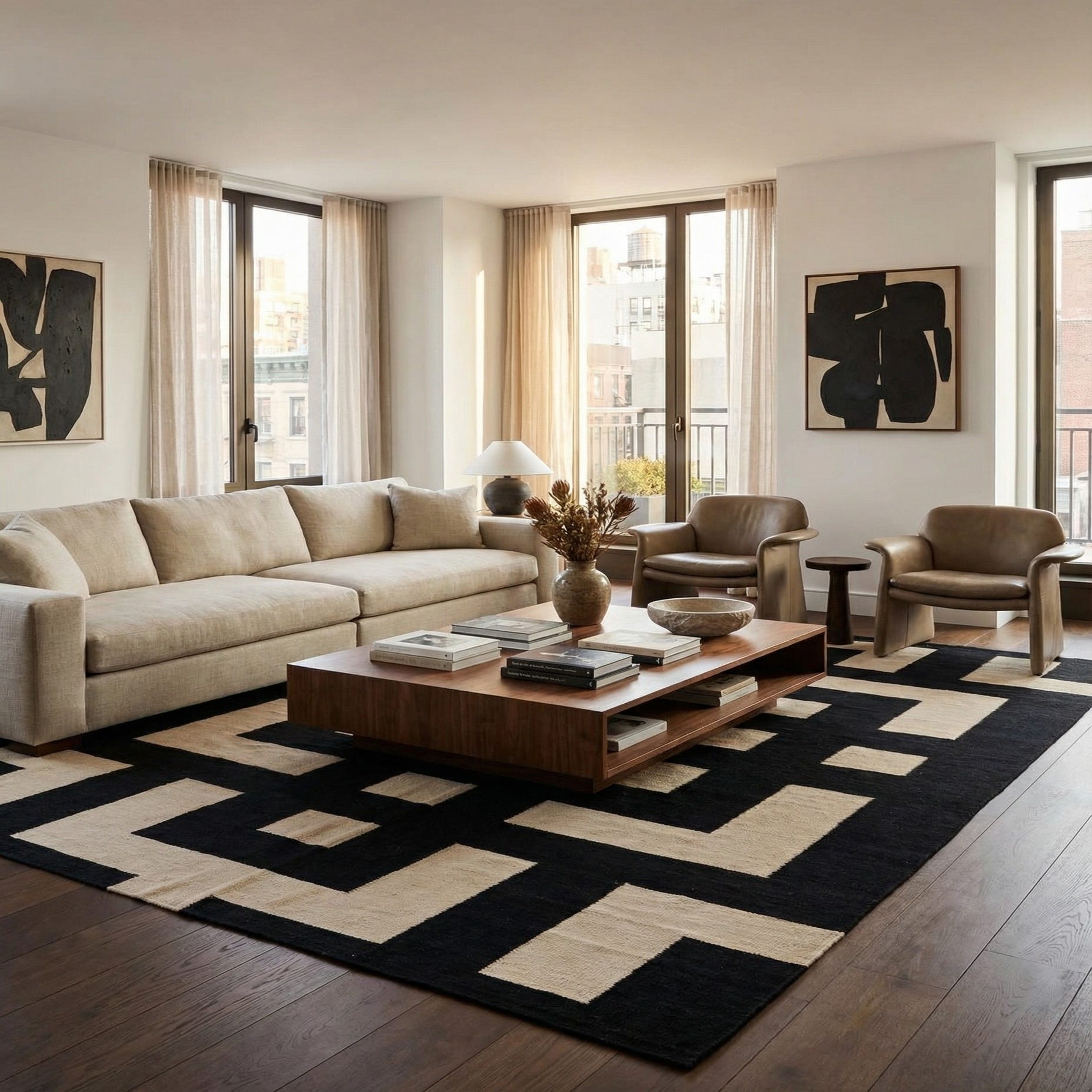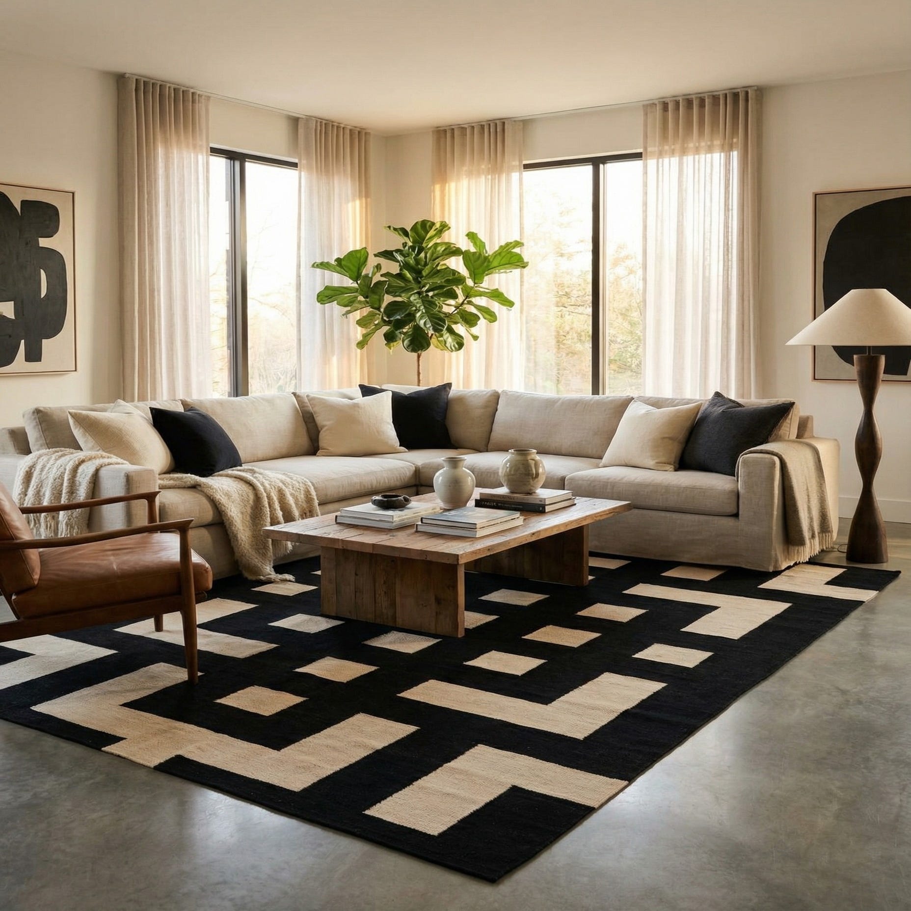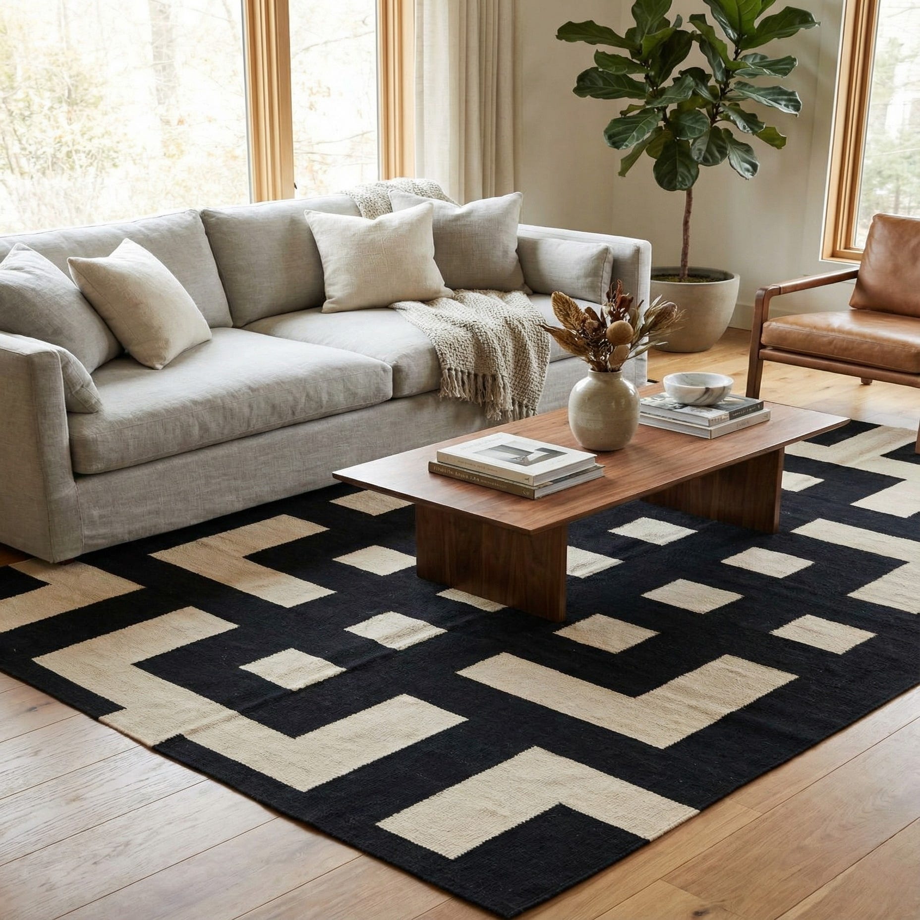Primary color is Black. Colors in this rug include: Black, Ivory.