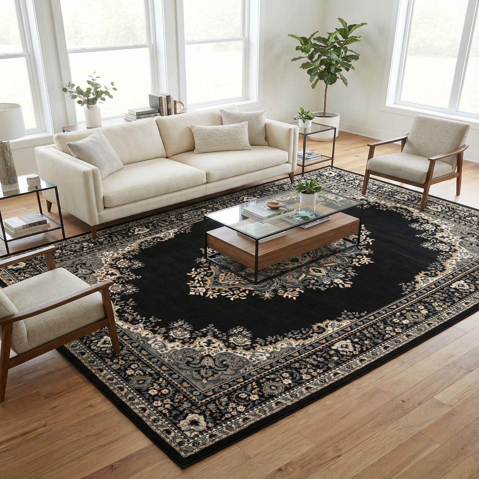 Primary color is Black. Colors in this rug include: Black, Beige, Light Blue.