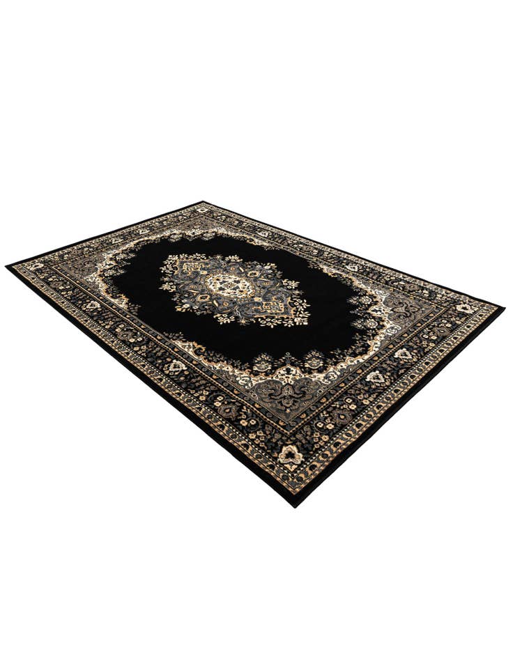 Primary color is Black. Colors in this rug include: Black, Beige, Light Blue.
