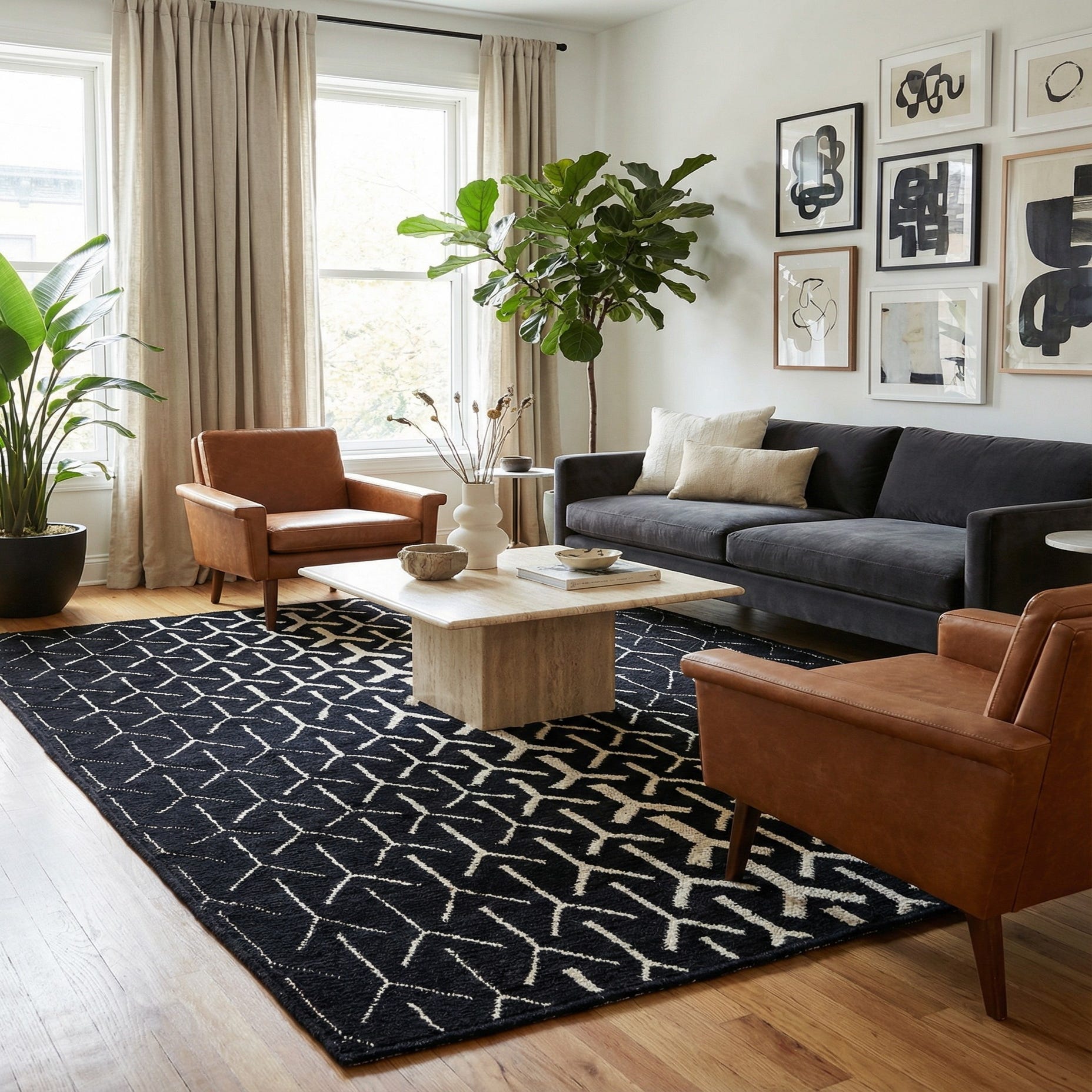 Primary color is Black. Colors in this rug include: Black, Ivory.