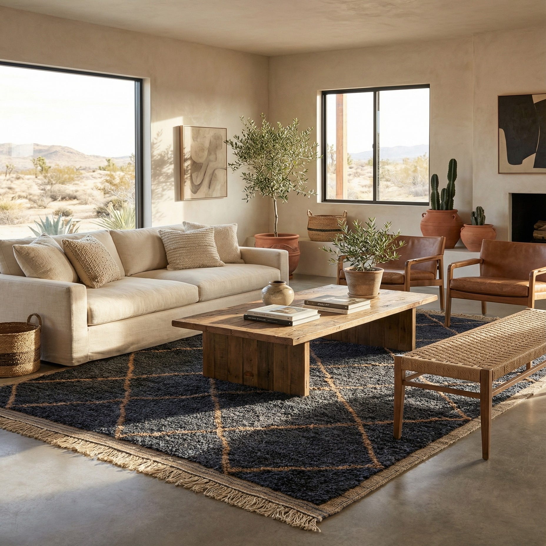 Primary color is Black. Colors in this rug include: Black, Blue, Brown.