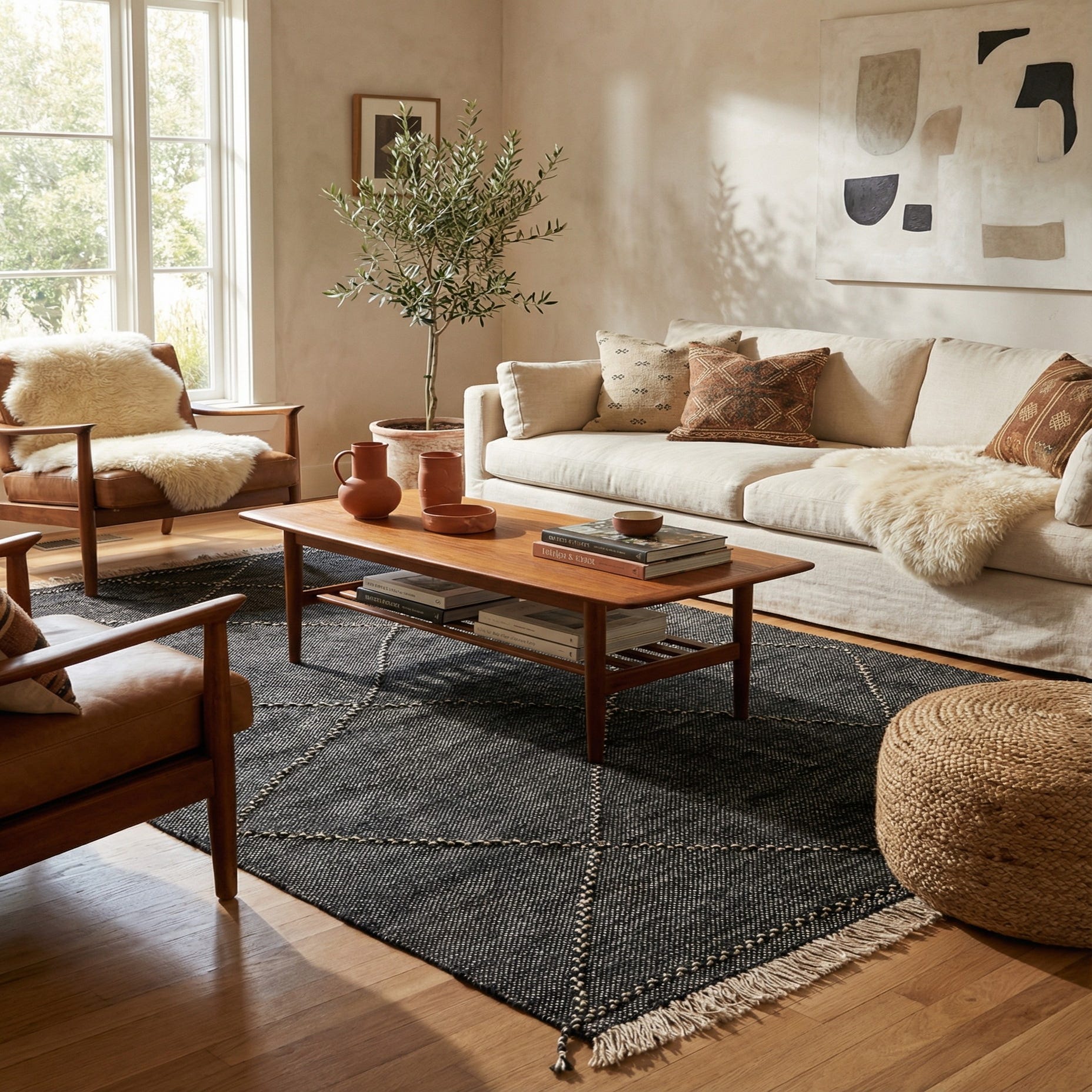 Primary color is Black. Colors in this rug include: Black, Beige.