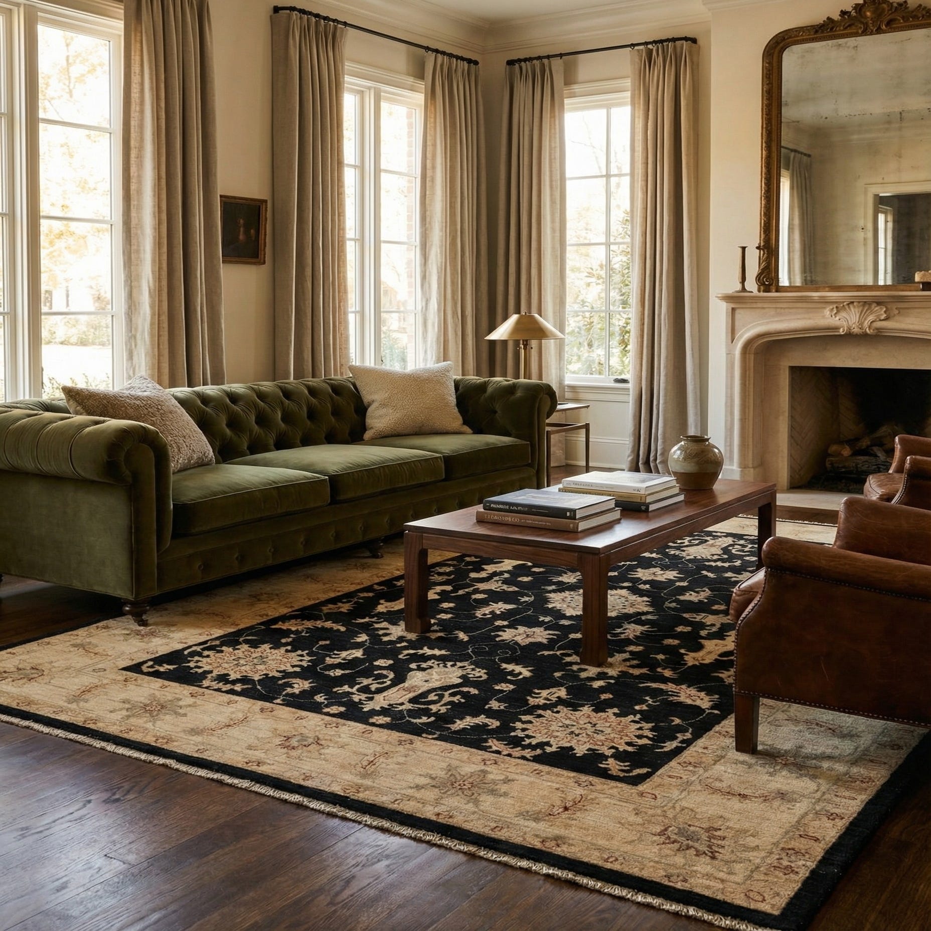 Primary color is Black. Colors in this rug include: Black, Beige, Brown, Burgundy, Cream, Light Green, Olive, Tan.