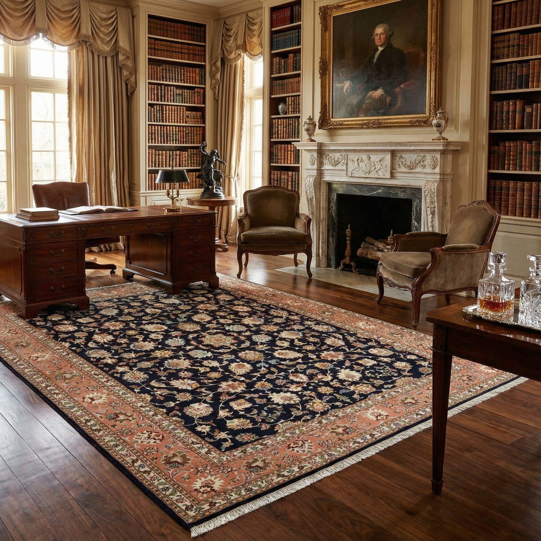 Primary color is Black. Colors in this rug include: Black, Black, Pink, Beige, Green, Beige.