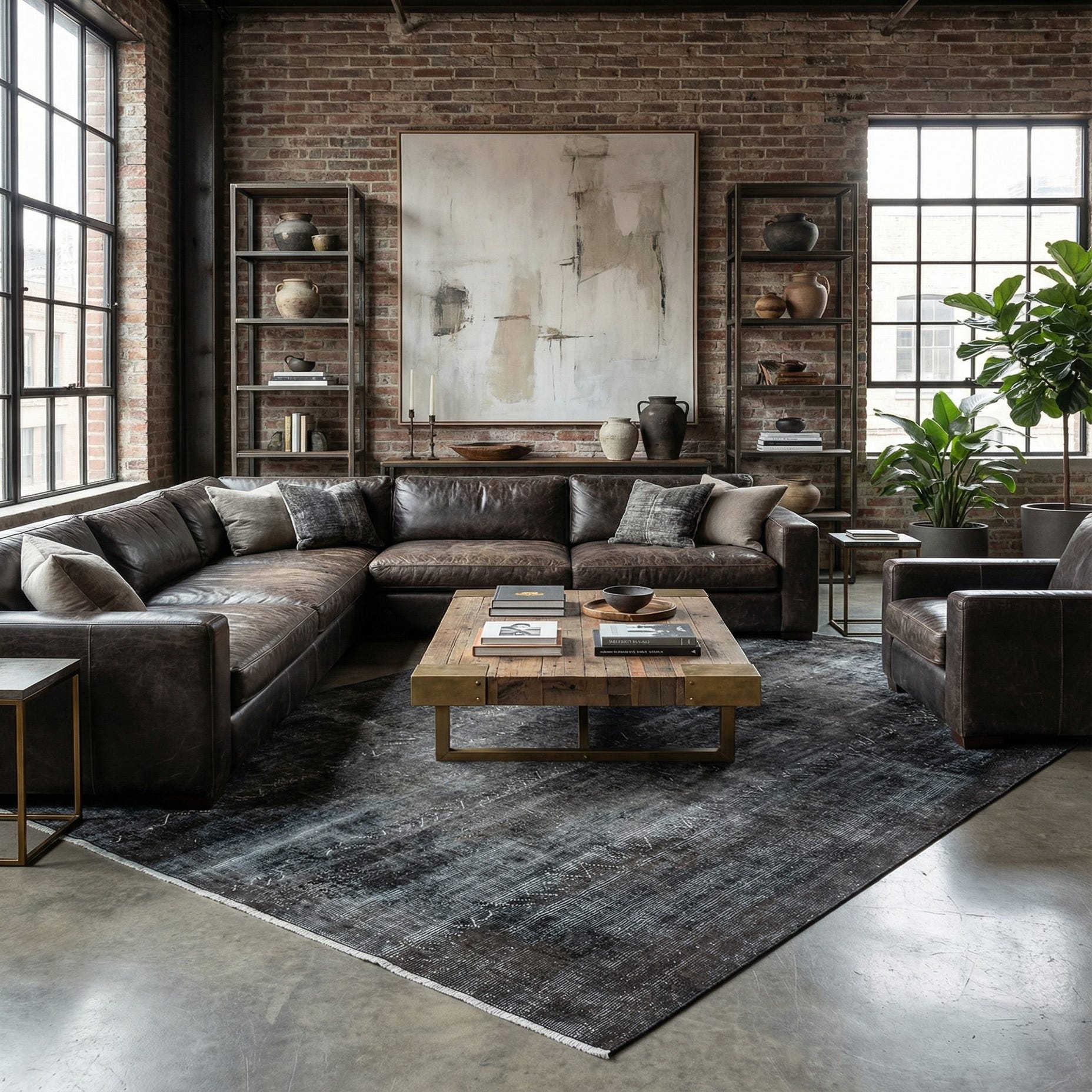 Primary color is Black. Colors in this rug include: Black, Brown, Gray, Silver.