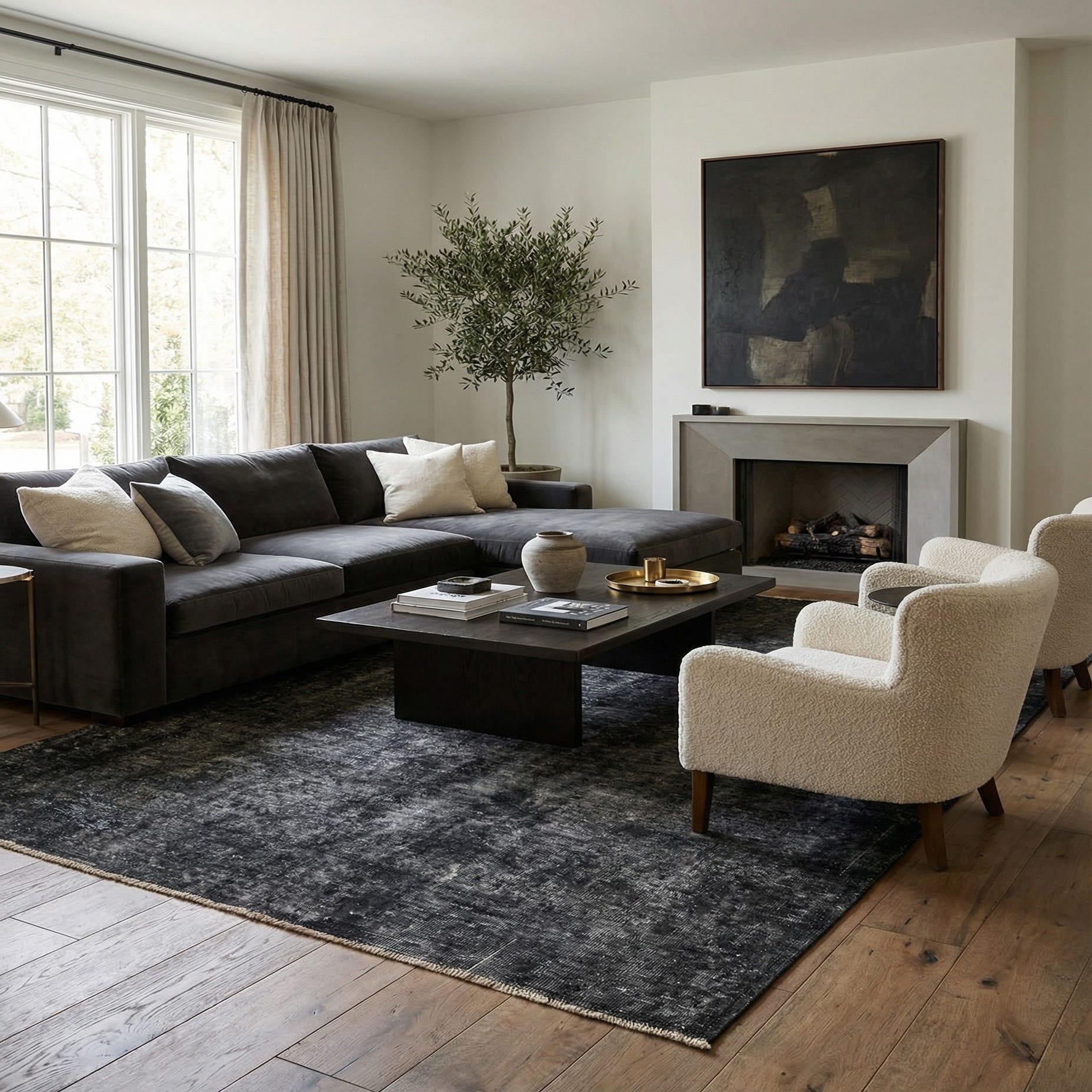 Primary color is Black. Colors in this rug include: Black, Ivory, Green.