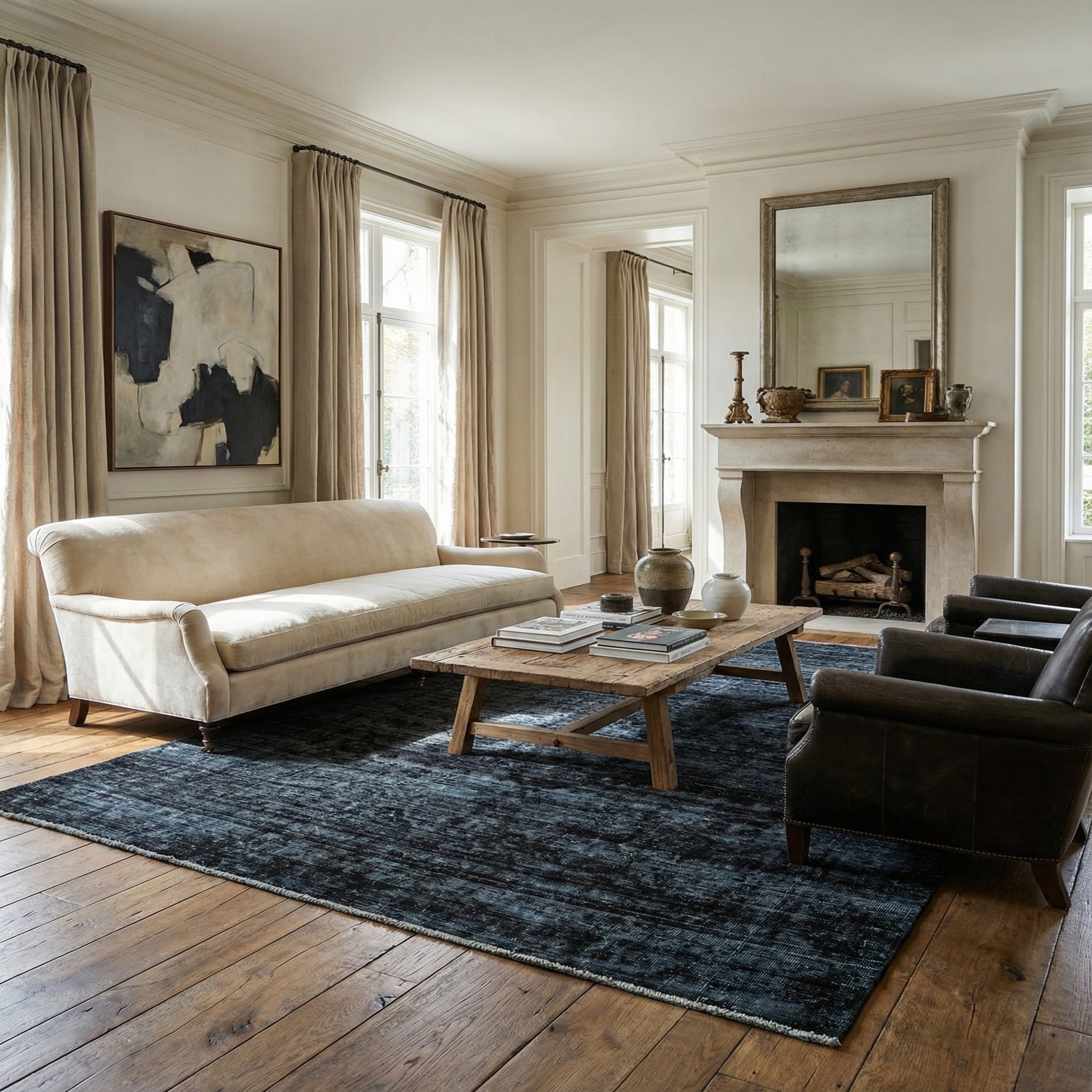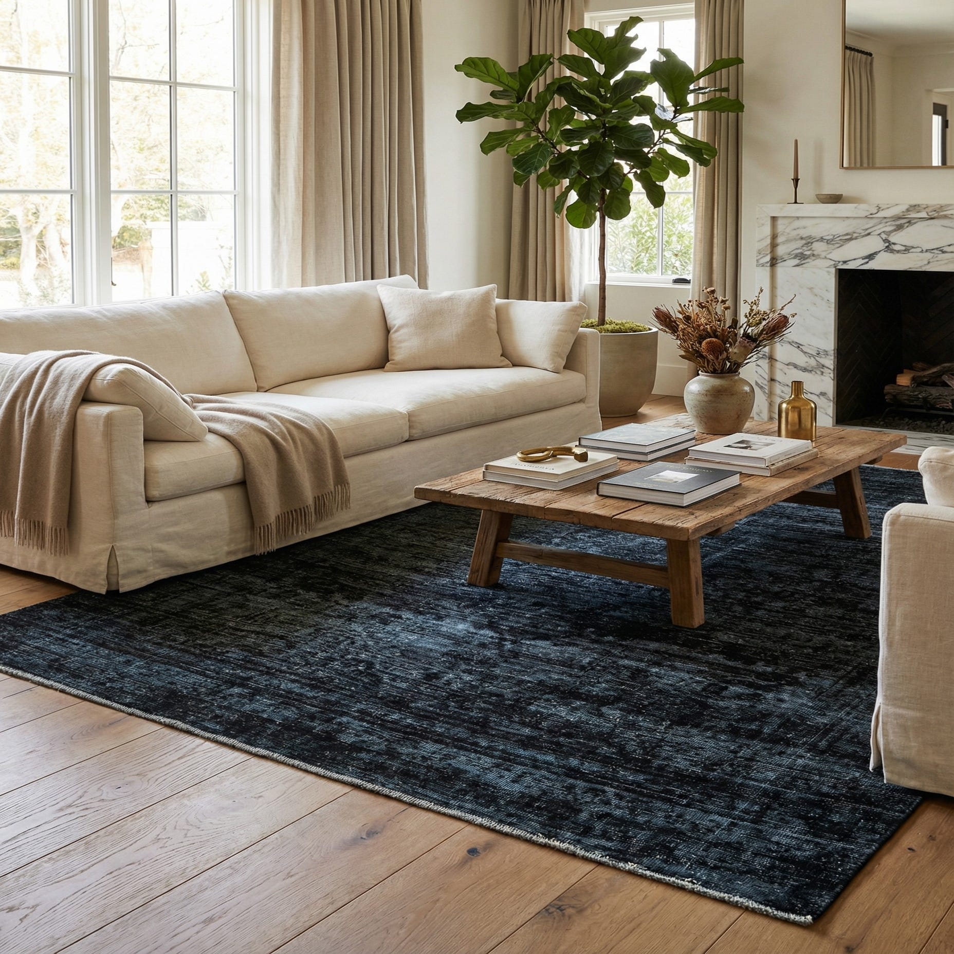 Primary color is Black. Colors in this rug include: Black, Blue.