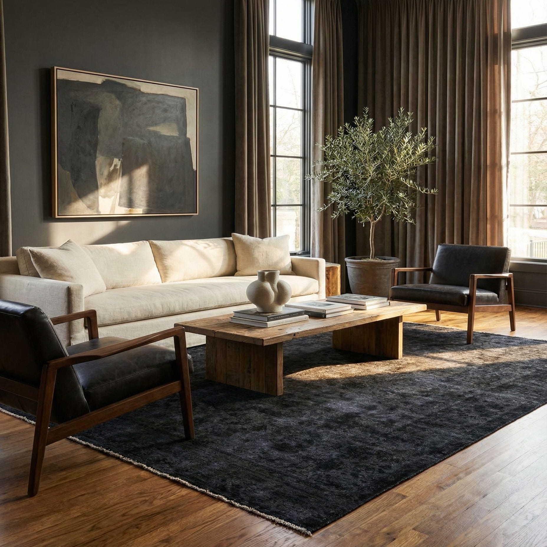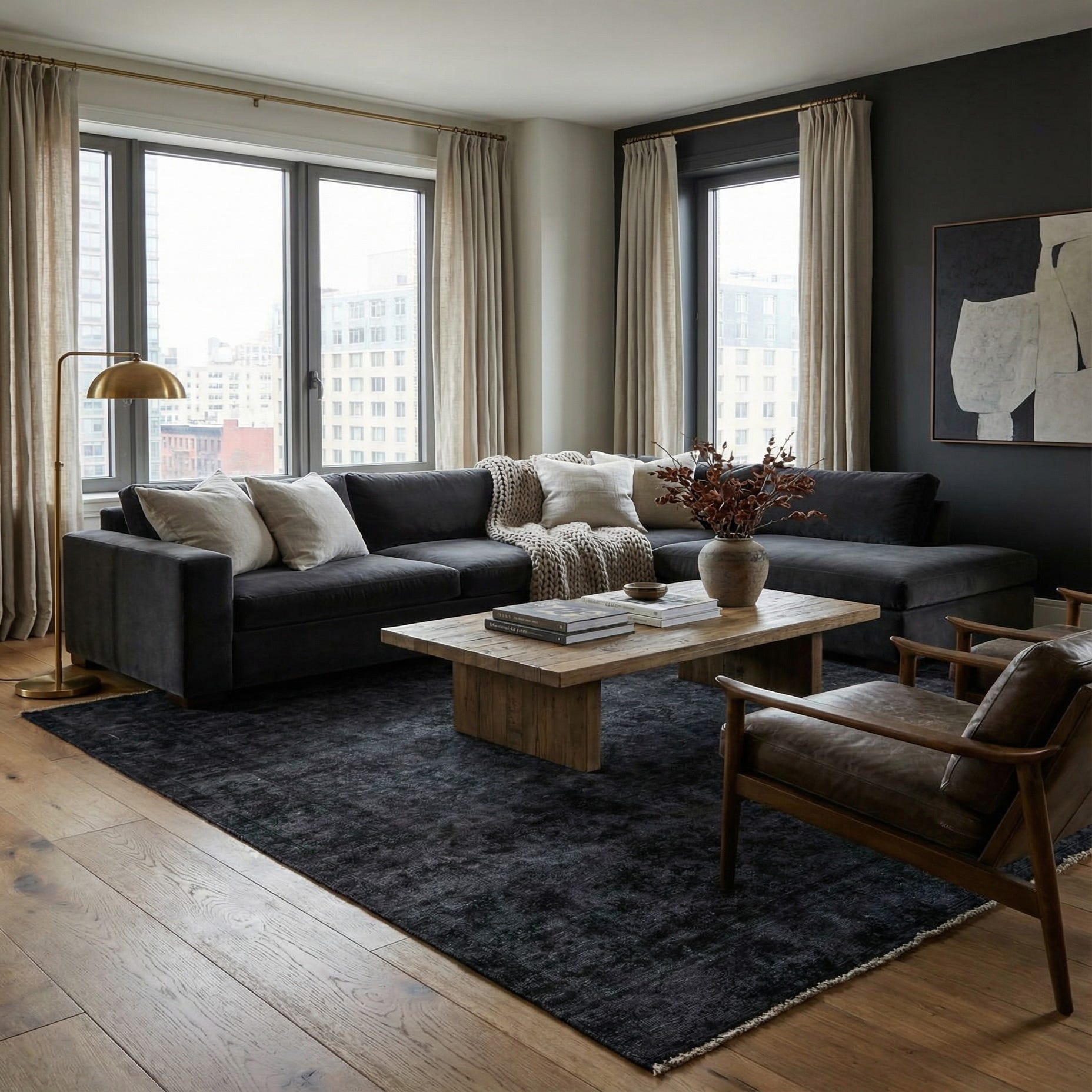 Primary color is Black. Colors in this rug include: Black, Gray.