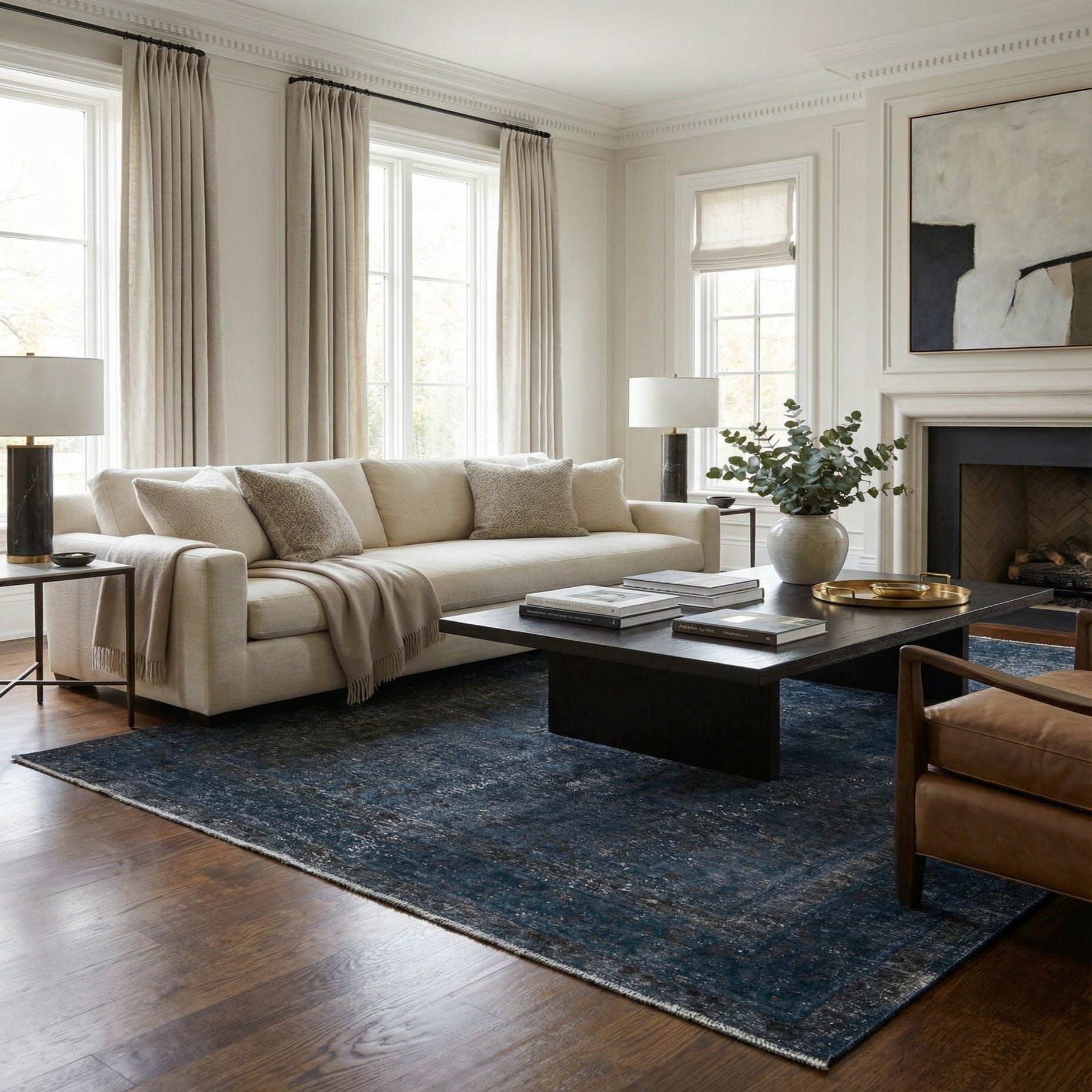 Primary color is Black. Colors in this rug include: Black, Ivory, Navy Blue, Gray.