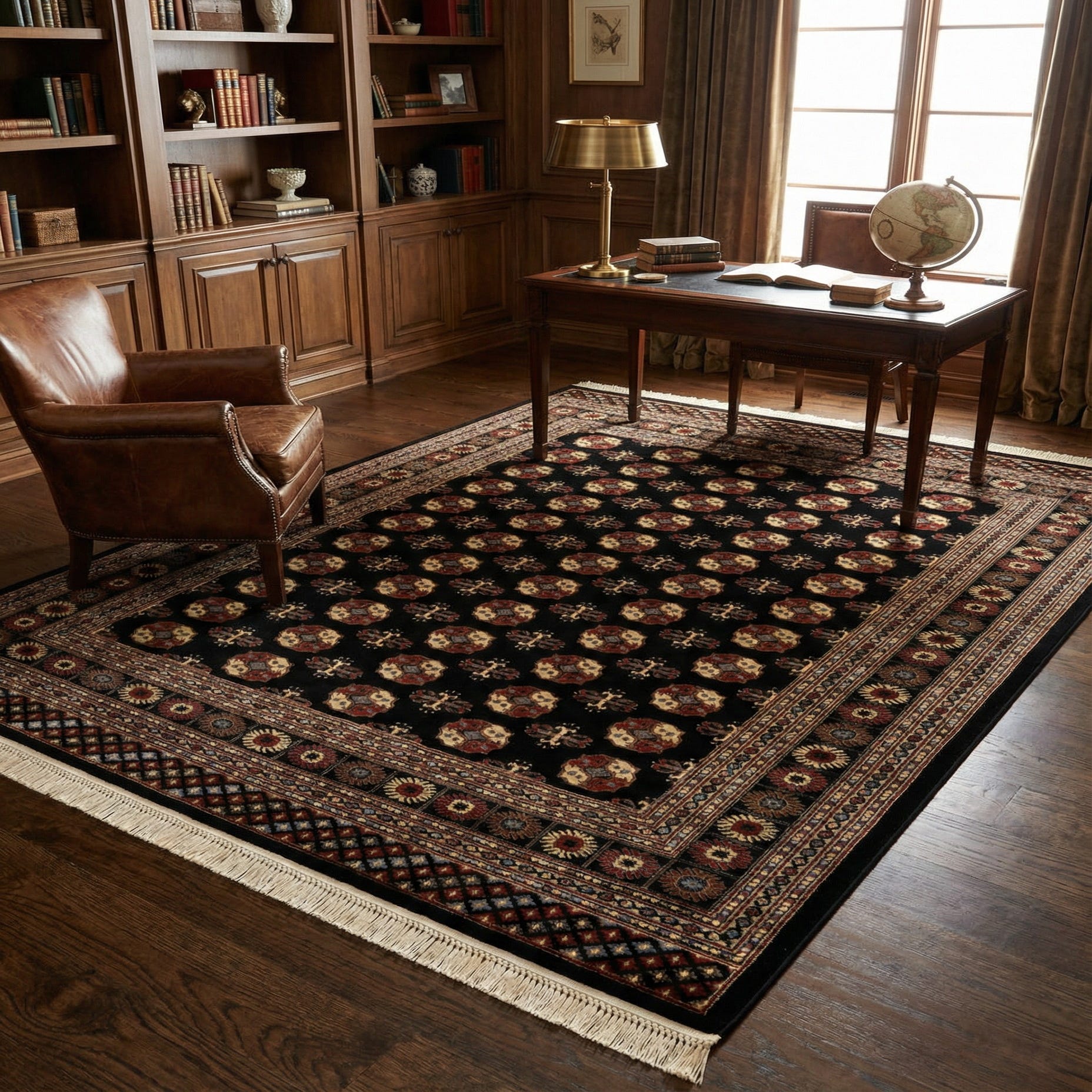 Primary color is Black. Colors in this rug include: Black, Beige, Blue, Brown, Ivory, Light Brown, Red.