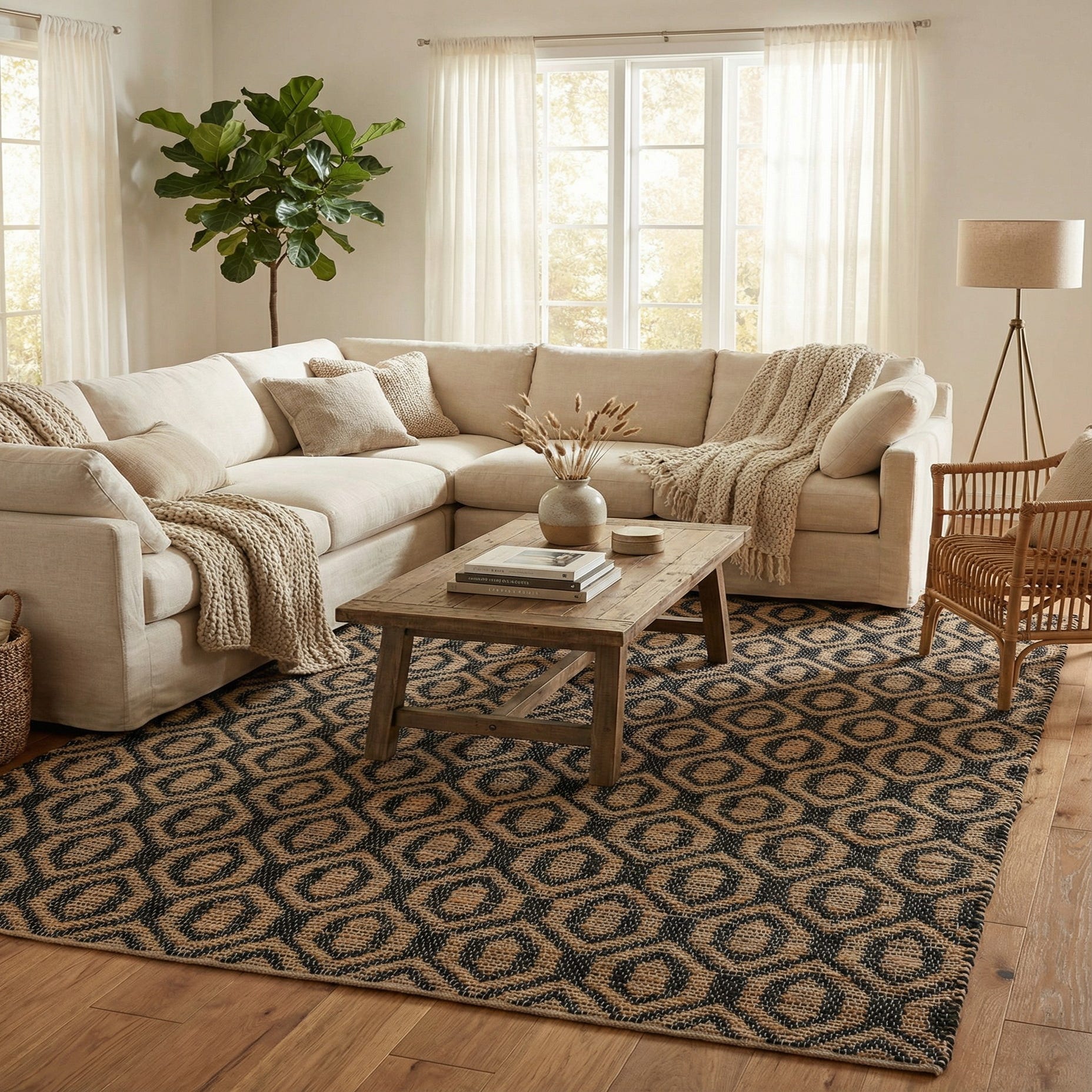 Primary color is Black. Colors in this rug include: Black, Natural.