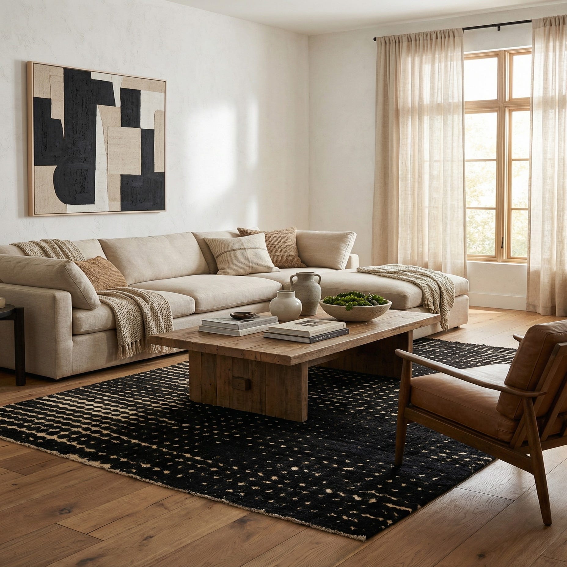 Primary color is Black. Colors in this rug include: Black, Ivory.