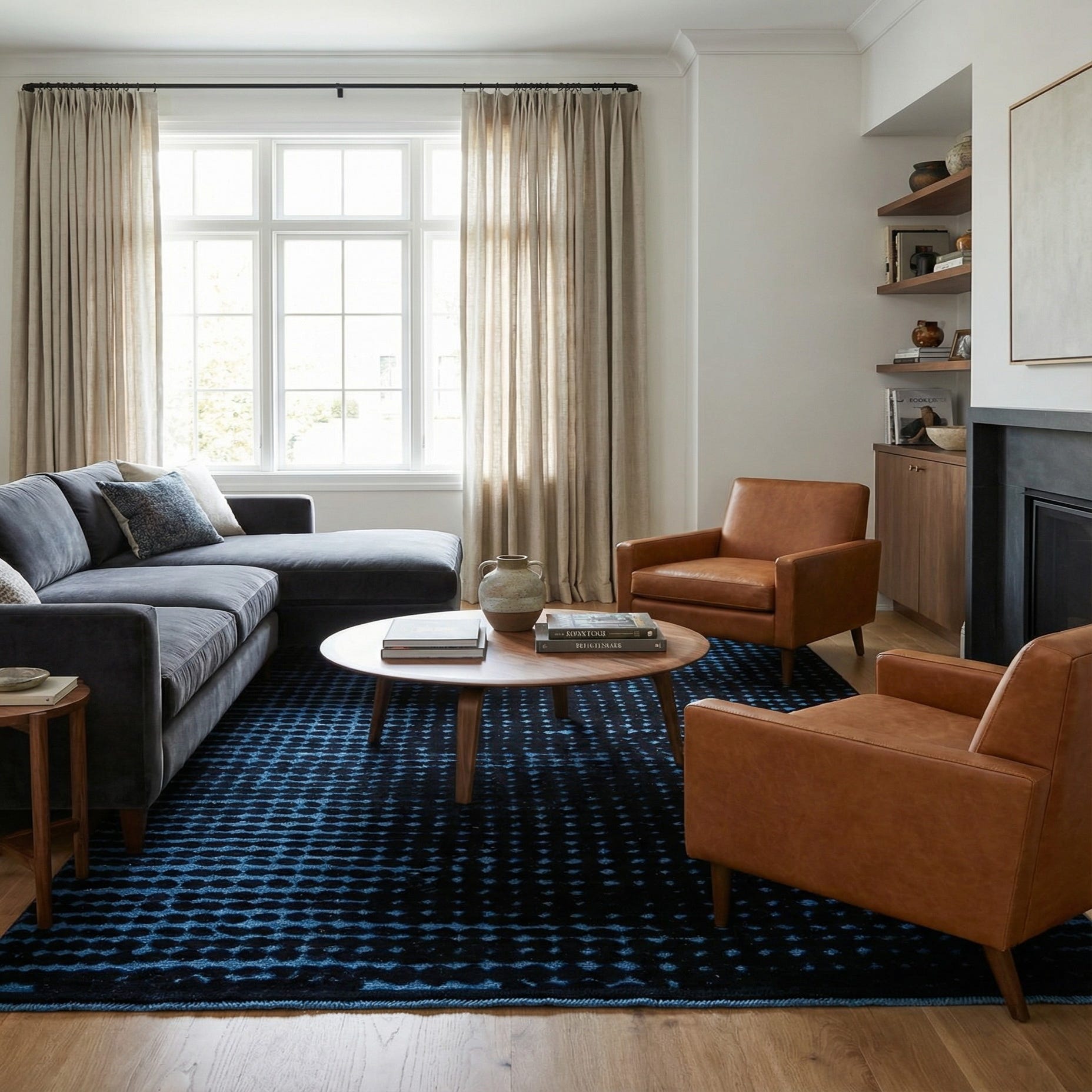 Primary color is Black. Colors in this rug include: Black, Navy Blue.