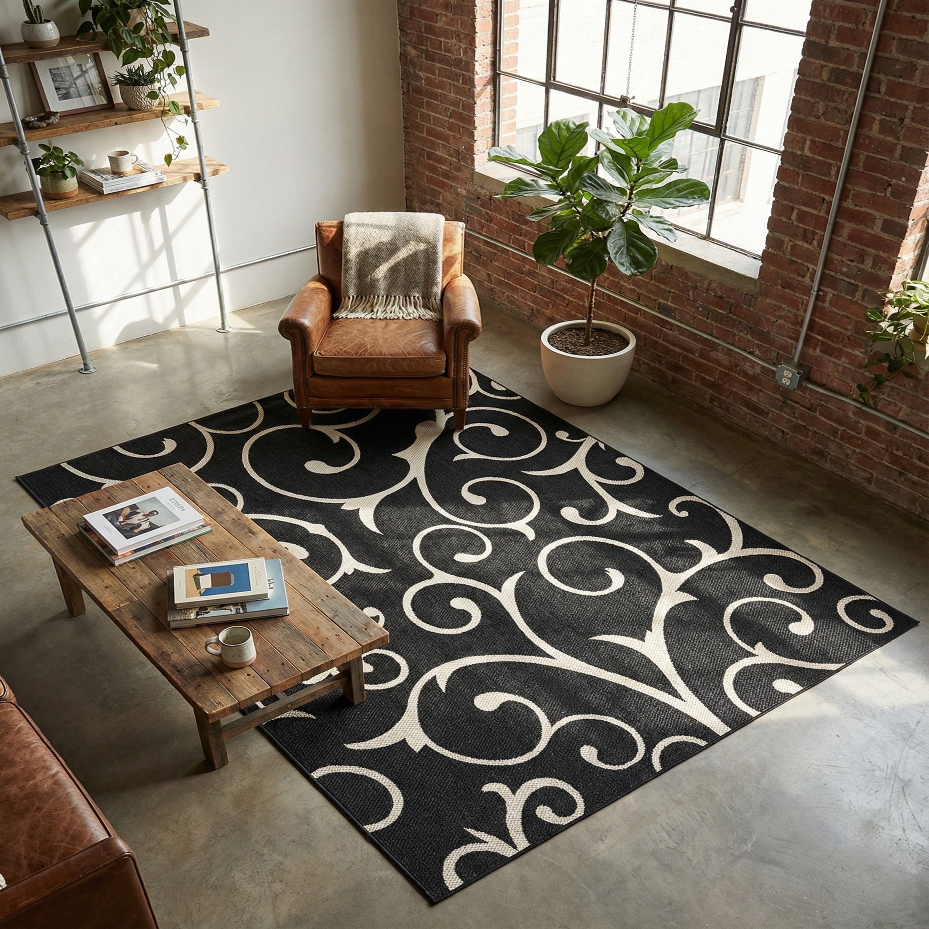 Primary color is Black. Colors in this rug include: Black, Ivory.