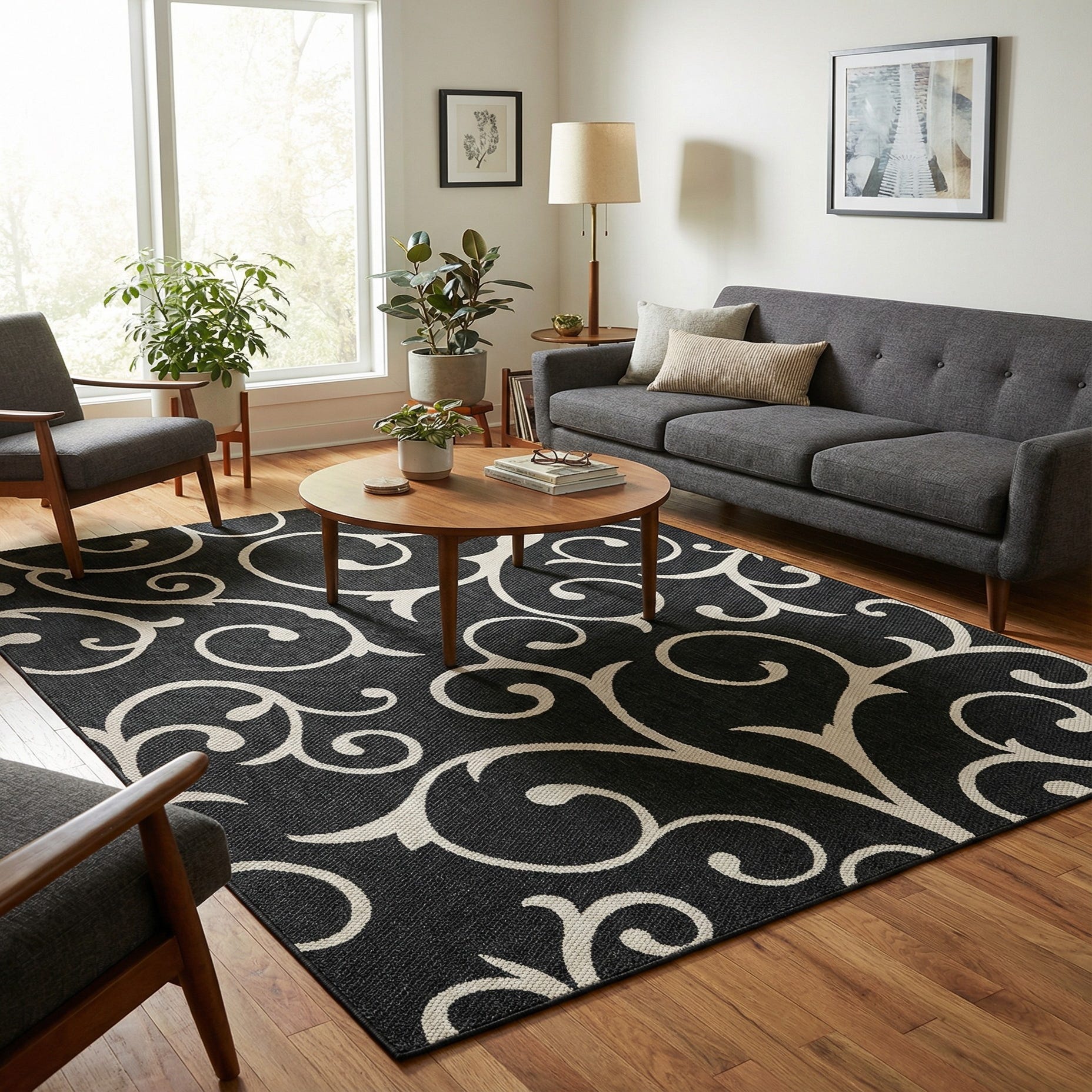 Primary color is Black. Colors in this rug include: Black, Ivory.