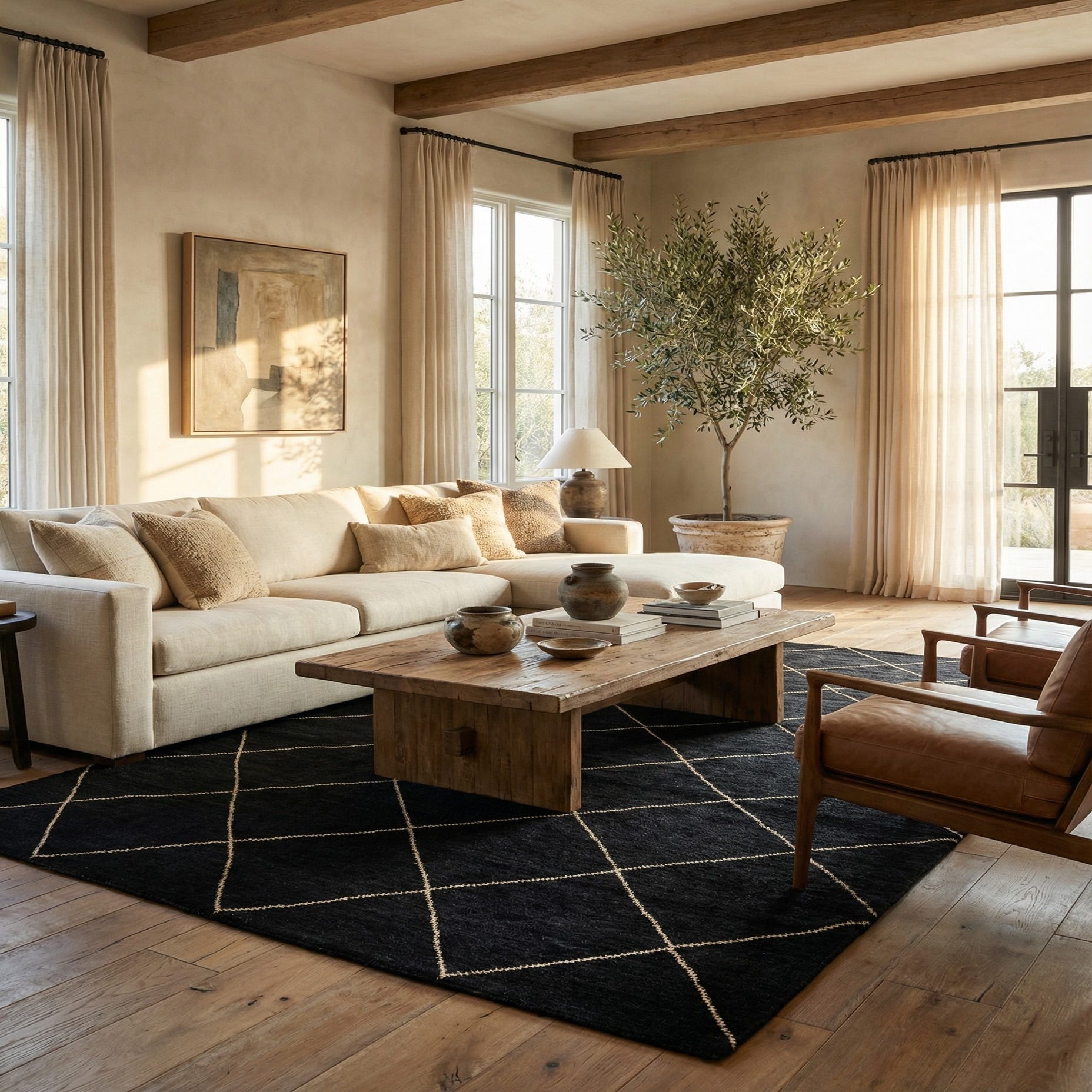 Primary color is Black. Colors in this rug include: Black, Ivory.