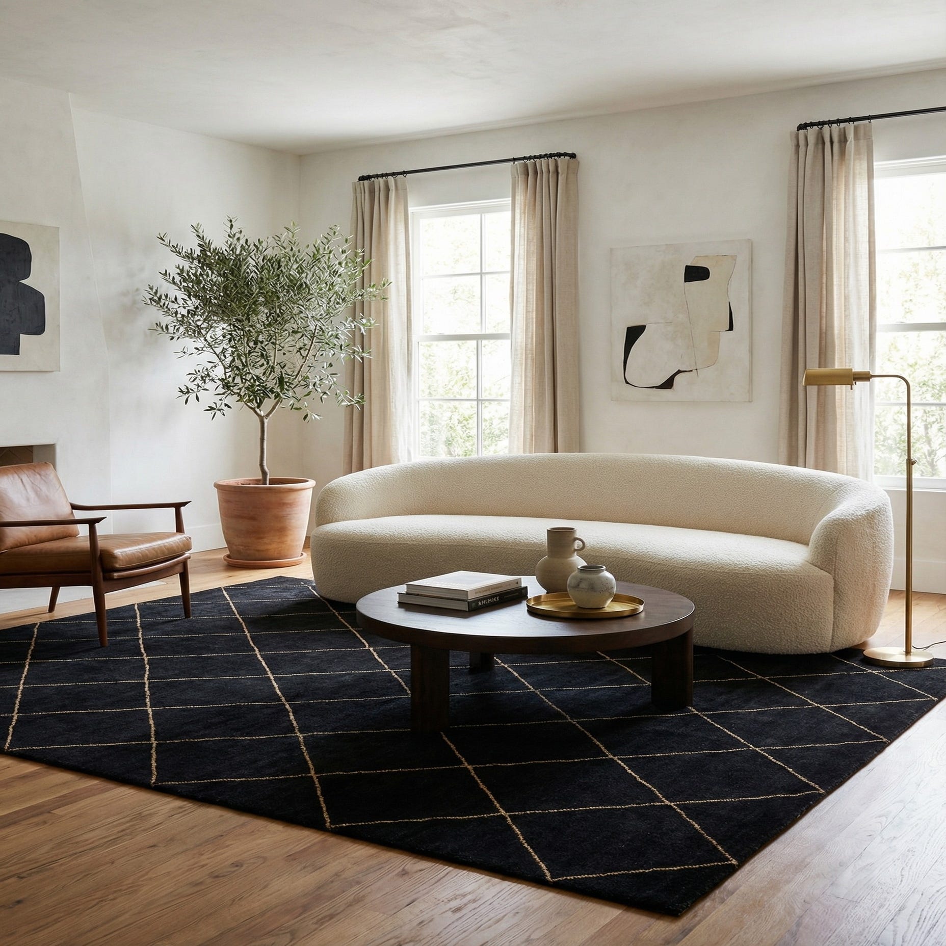 Primary color is Black. Colors in this rug include: Black, Ivory.