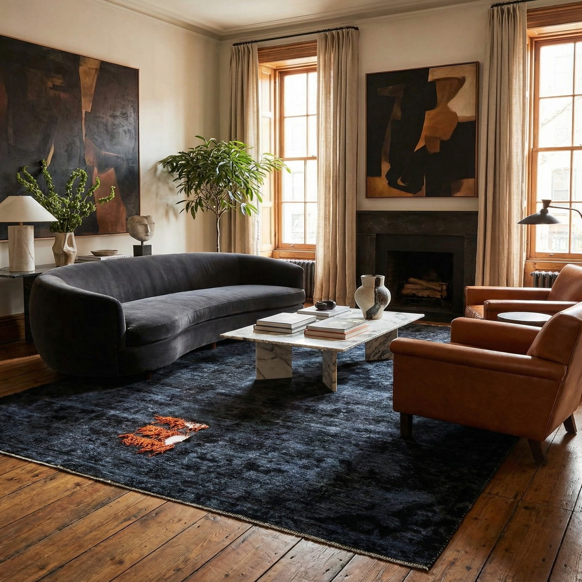 Primary color is Black. Colors in this rug include: Black, Gray, Orange.