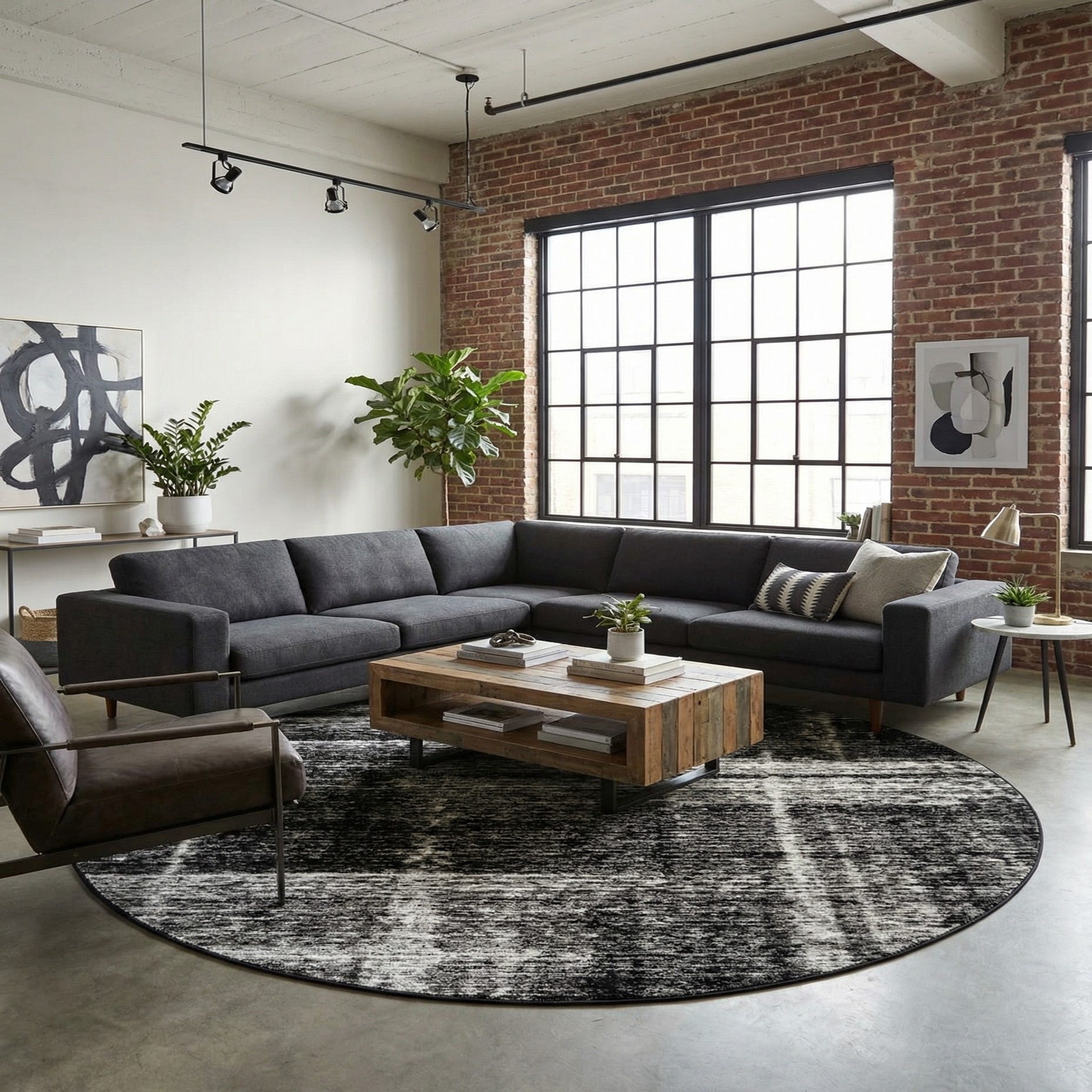 Primary color is Black. Colors in this rug include: Black, Gray, Ivory.
