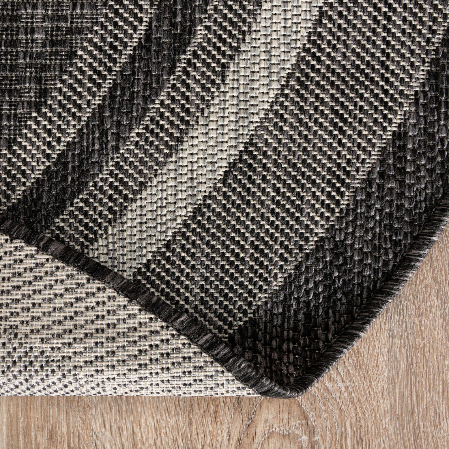 Primary color is Black. Colors in this rug include: Black, Beige.
