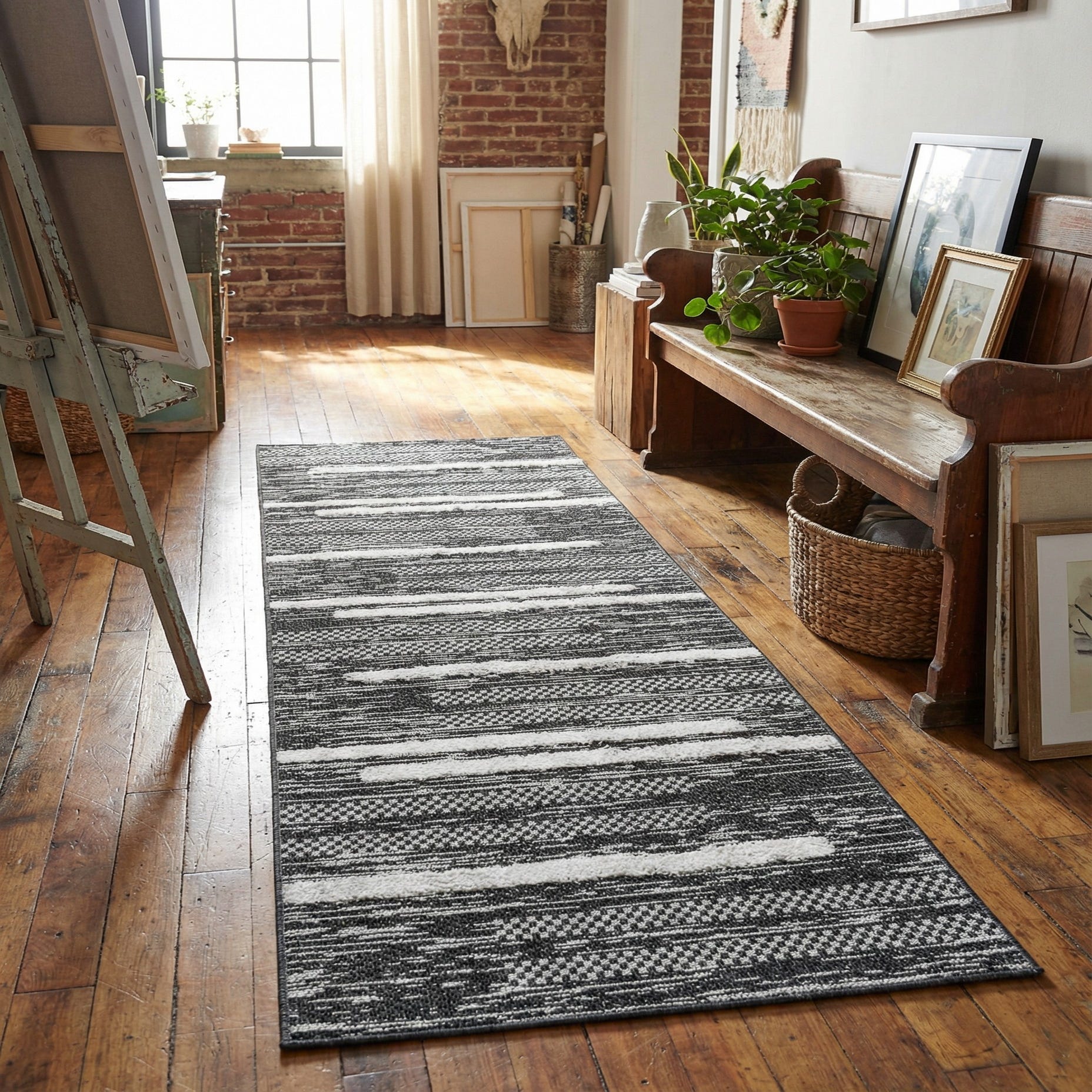 Primary color is Black. Colors in this rug include: Black, Gray, Ivory.