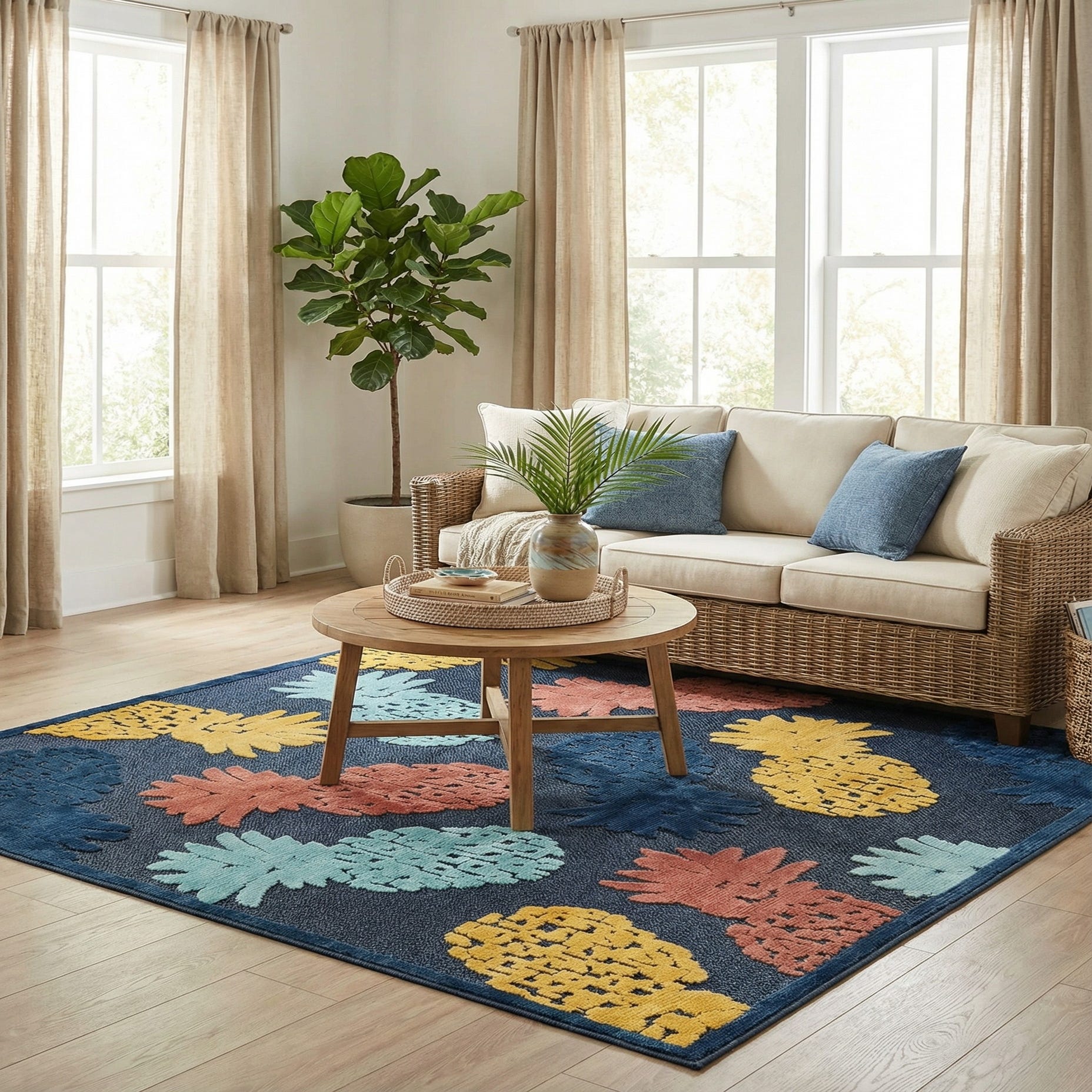 Primary color is Black. Colors in this rug include: Black, Light Blue, Navy Blue, Pink, Orange.