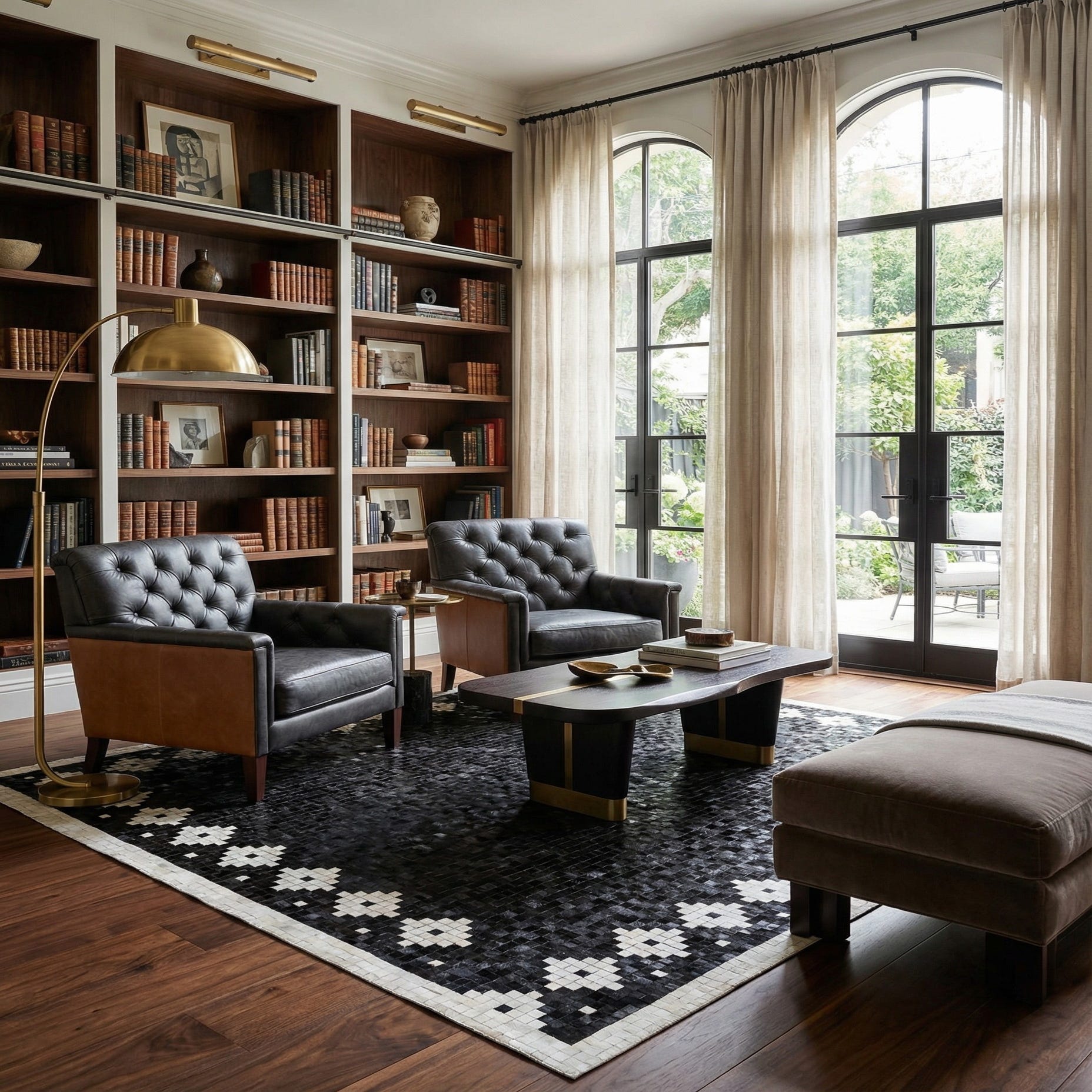 Primary color is Black. Colors in this rug include: Black, Brown, Tan, Ivory.