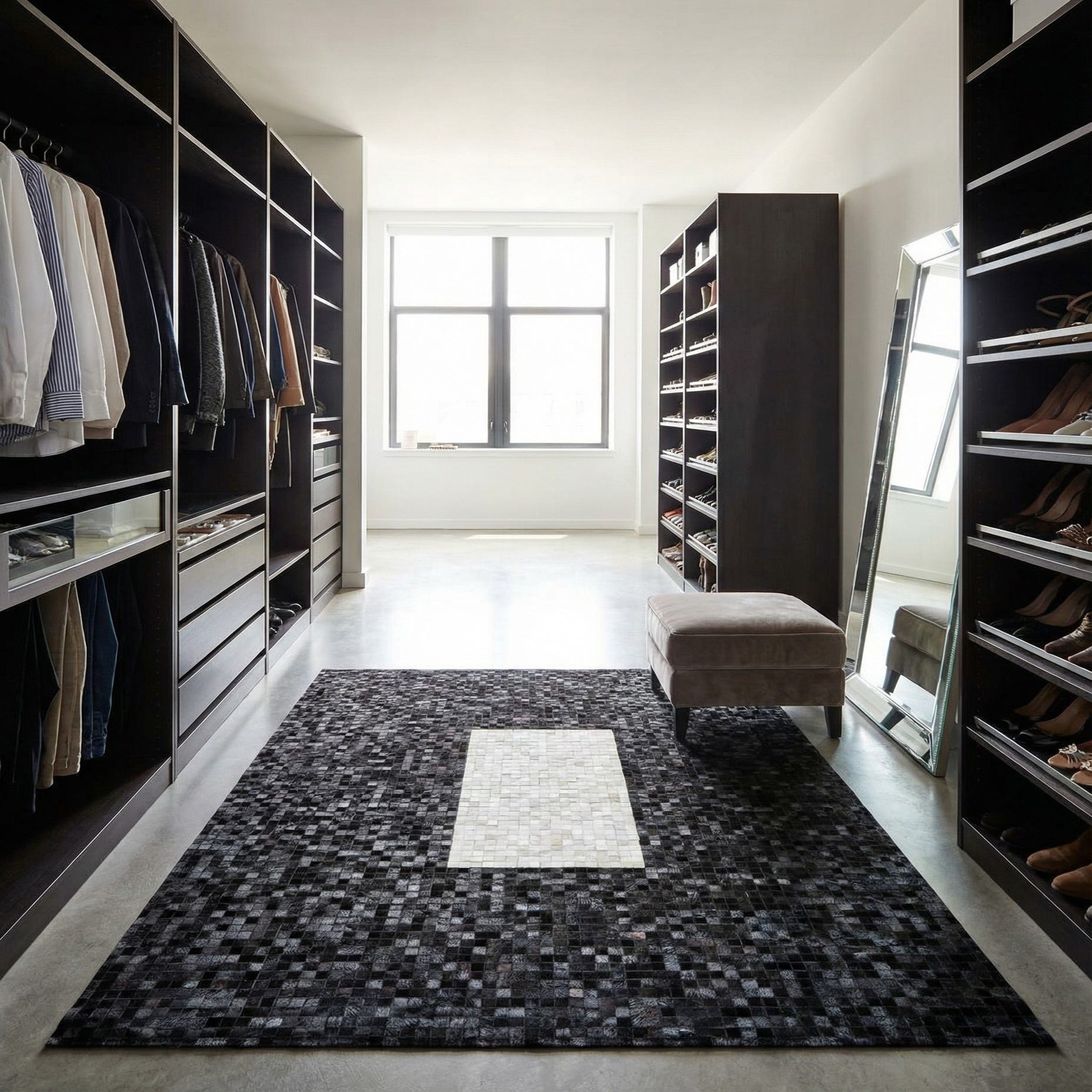 Primary color is Black. Colors in this rug include: Black, Ivory, Tan.