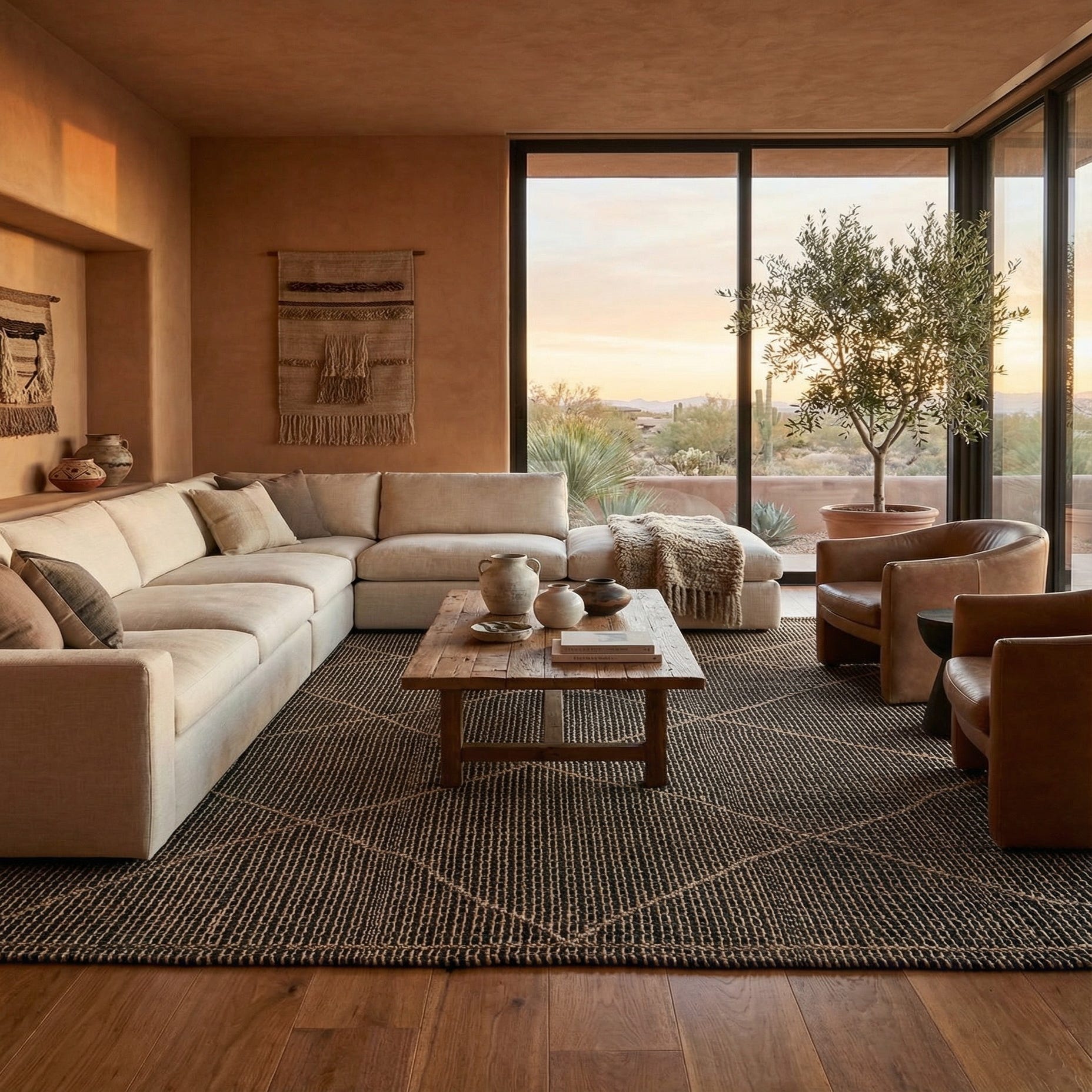 Primary color is Black. Colors in this rug include: Black, Natural.