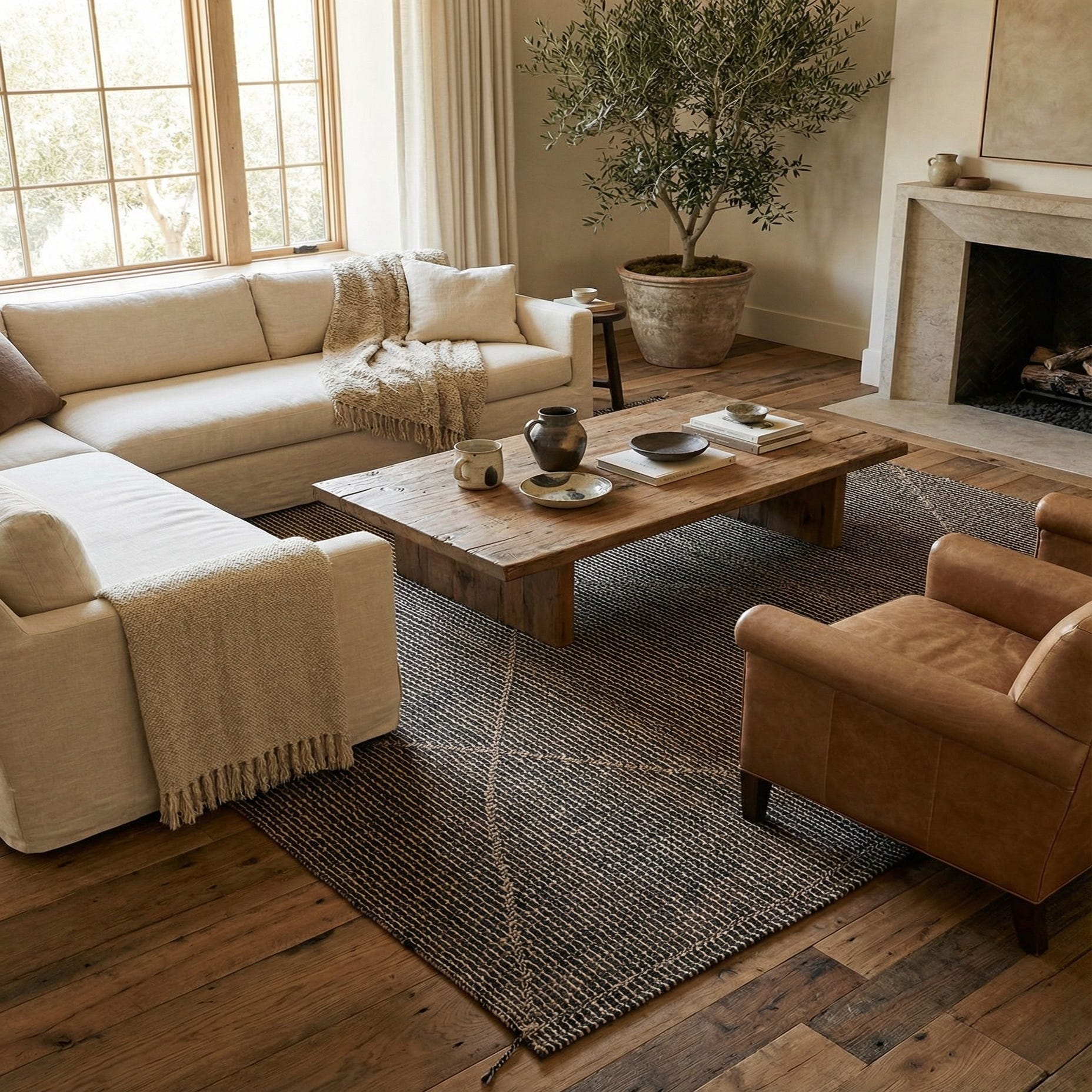 Primary color is Black. Colors in this rug include: Black, Natural.