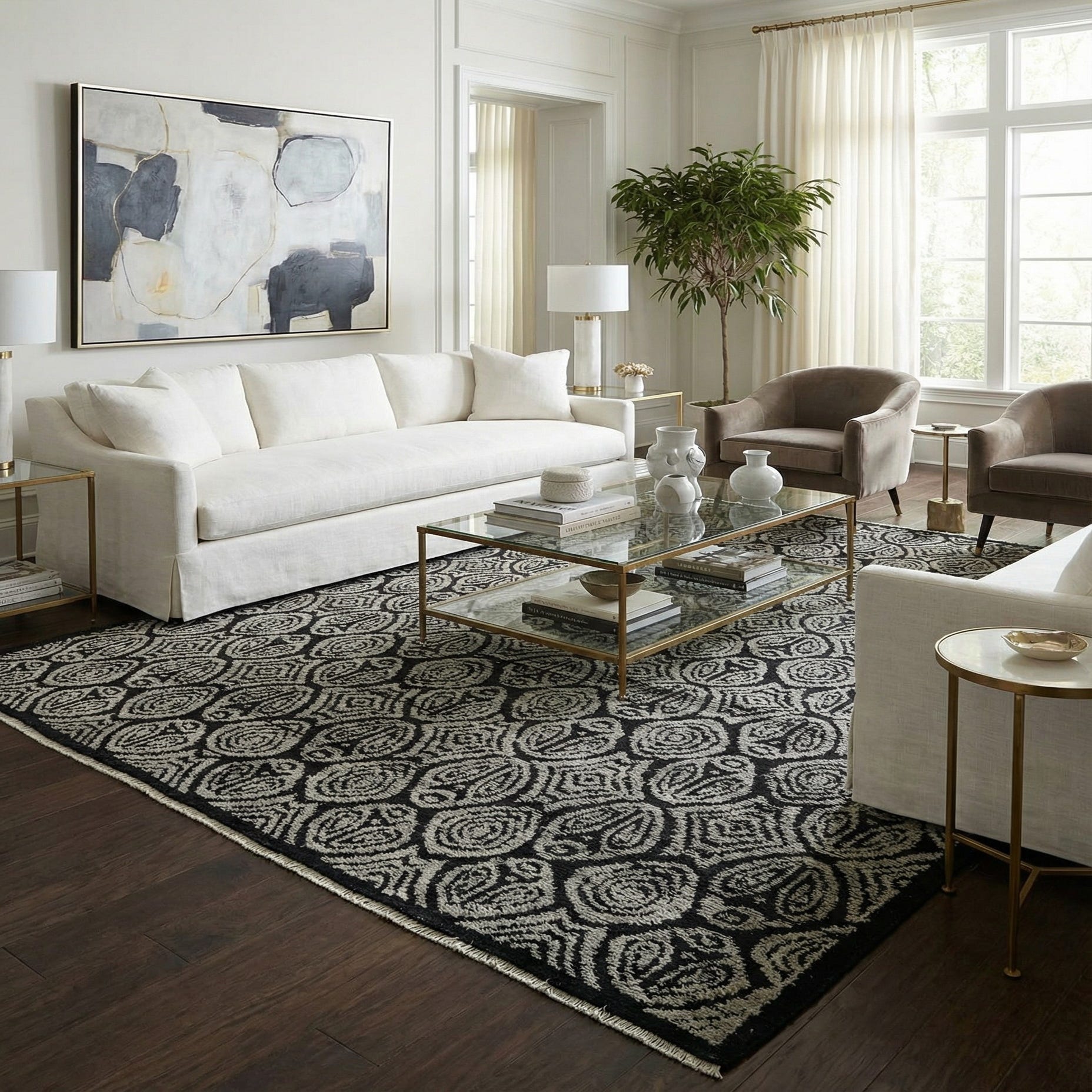 Primary color is Black. Colors in this rug include: Black, Gray.