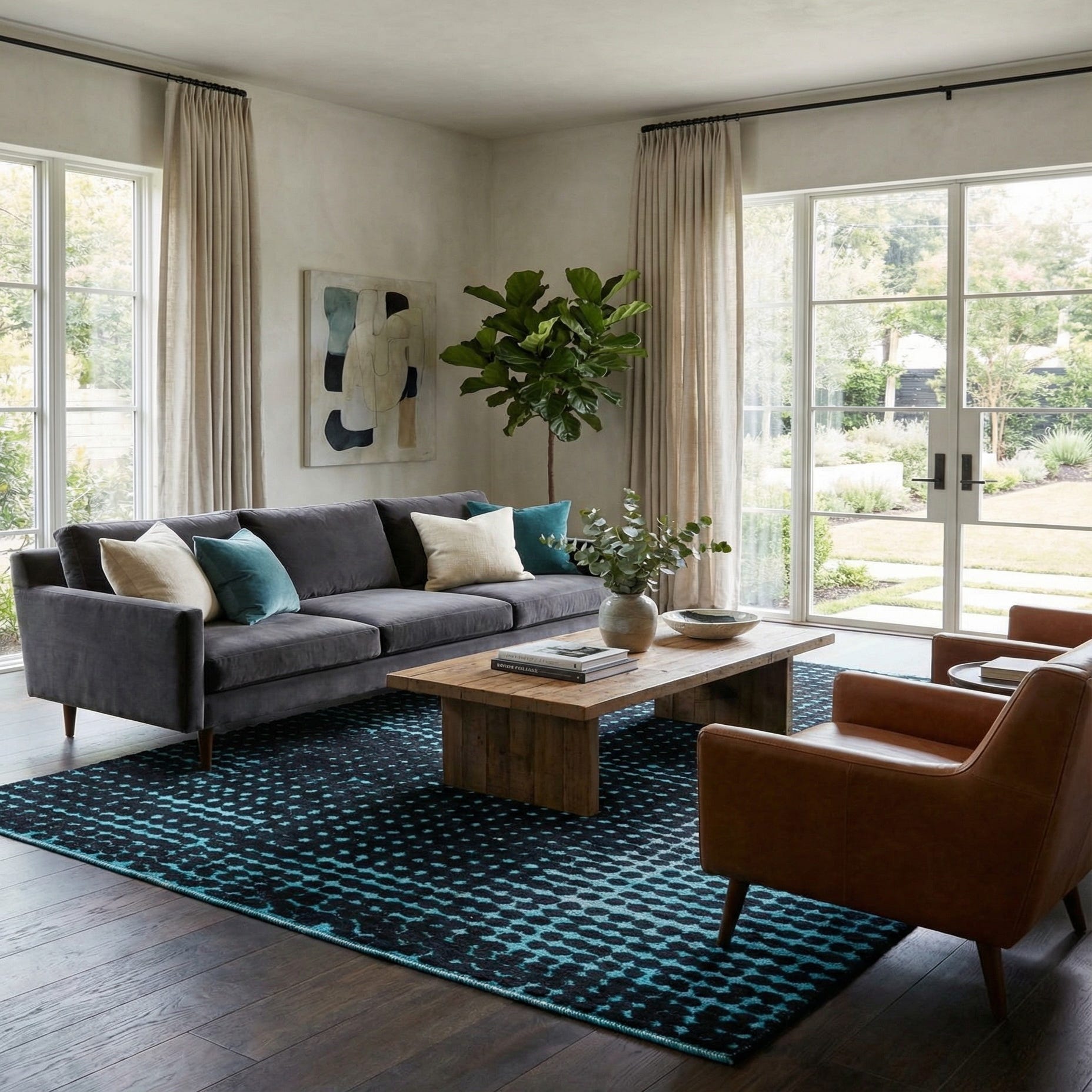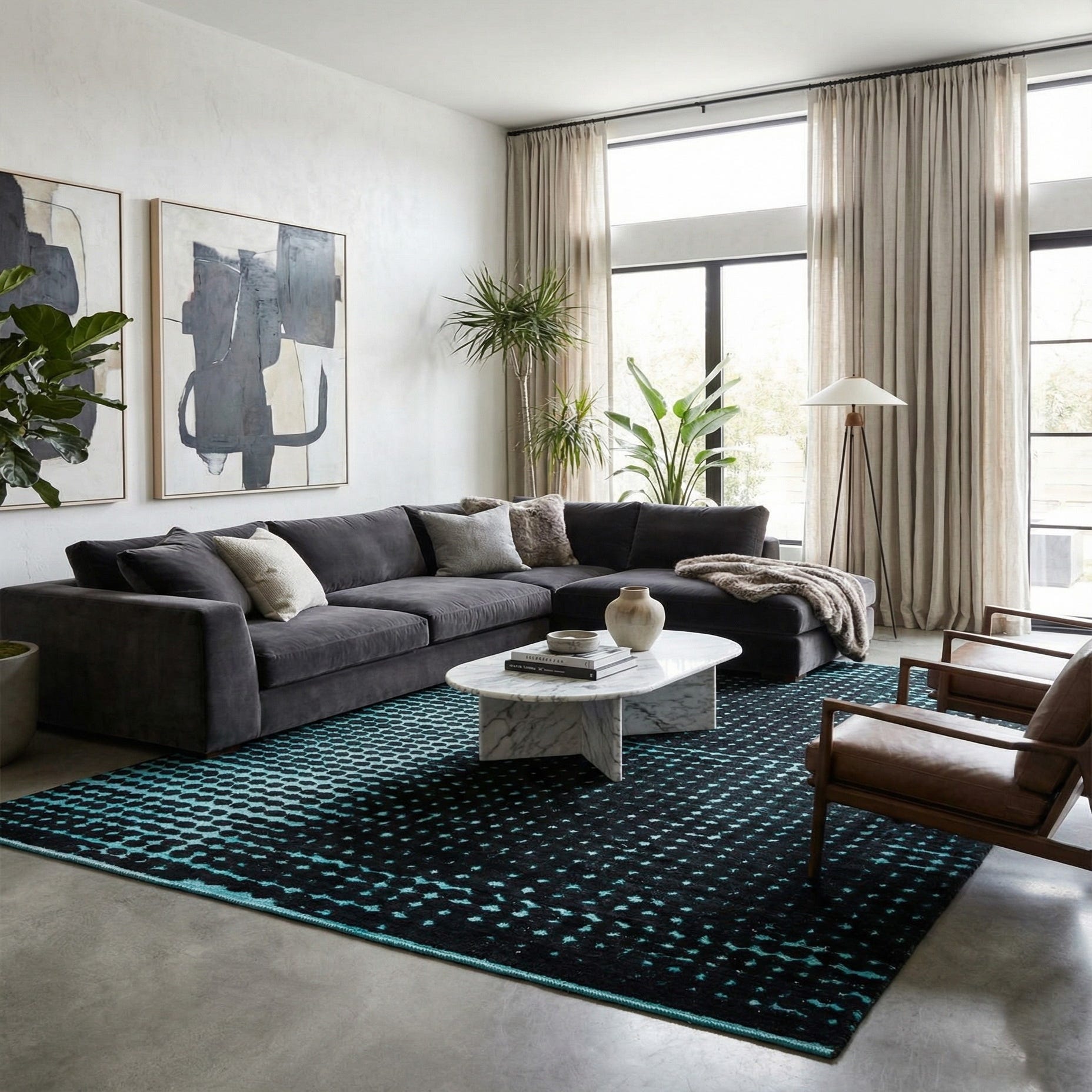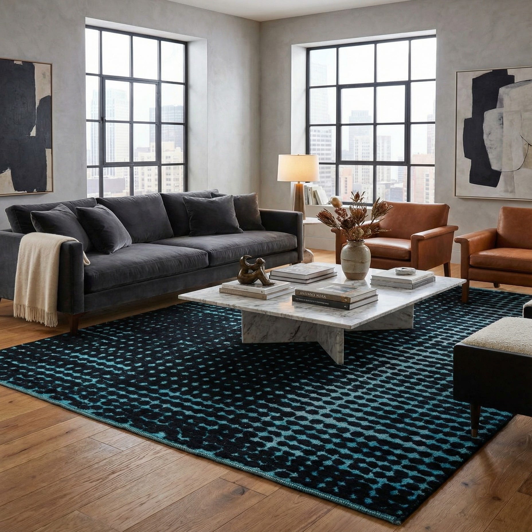Primary color is Black. Colors in this rug include: Black, Blue.