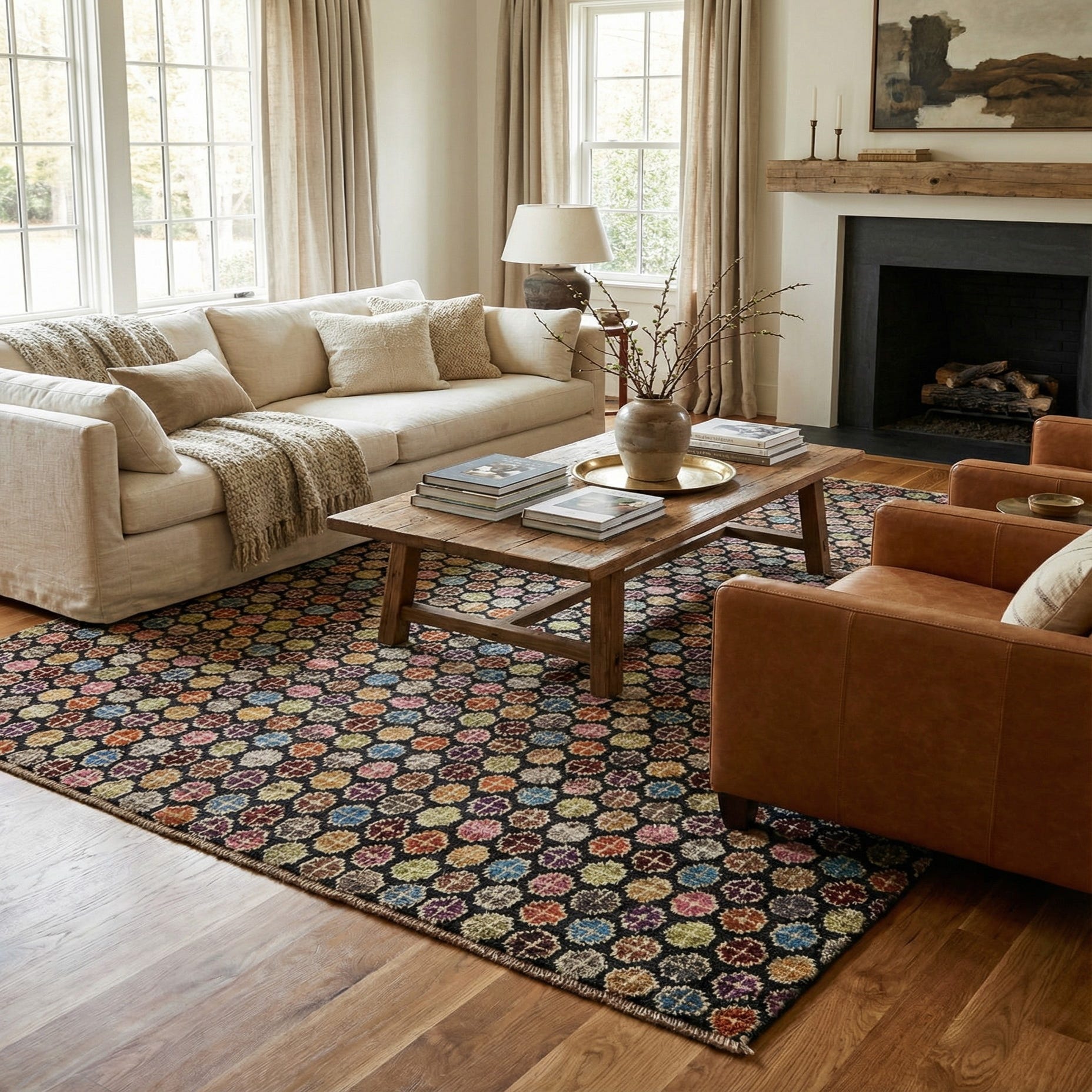 Primary color is Black. Colors in this rug include: Black, Ivory, Light Blue, Light Green, Orange, Purple, Red, Yellow, Pink, Gray, Green.