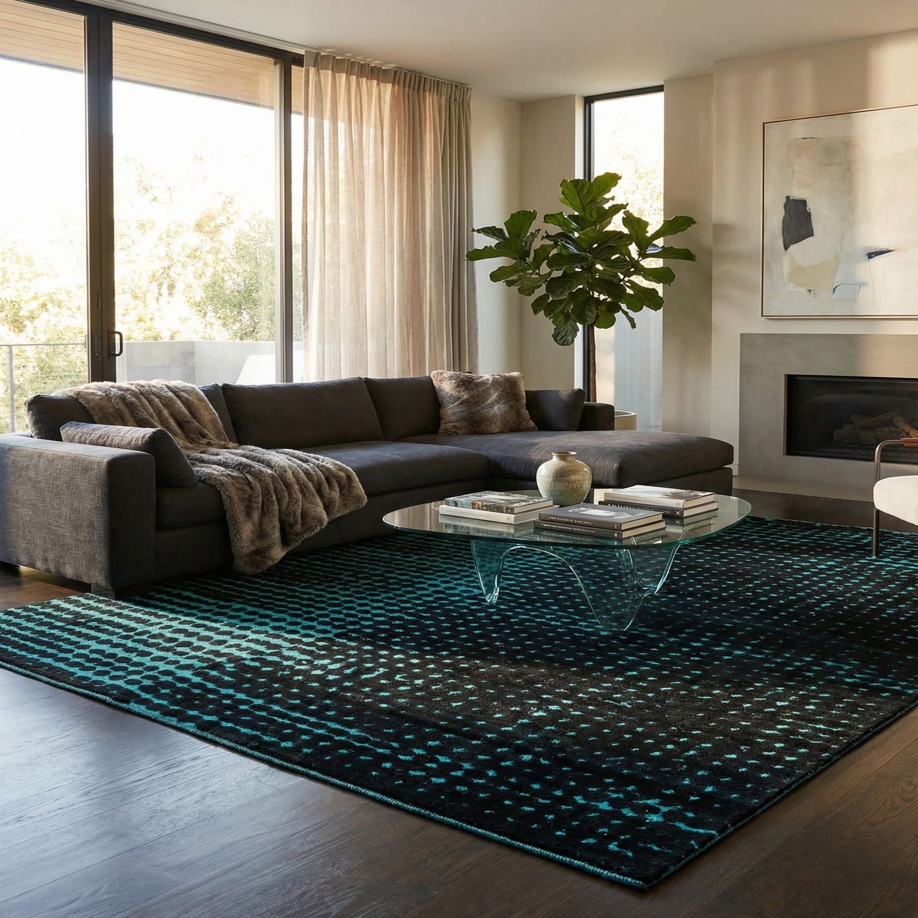 Primary color is Black. Colors in this rug include: Black, Hunter Green.
