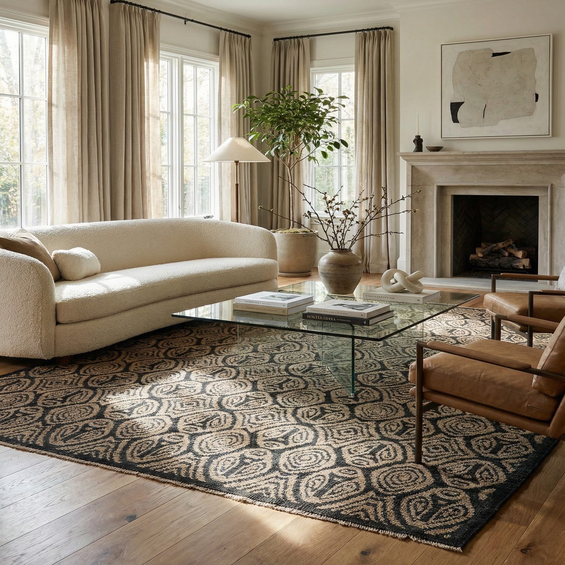 Primary color is Black. Colors in this rug include: Black, Brown.