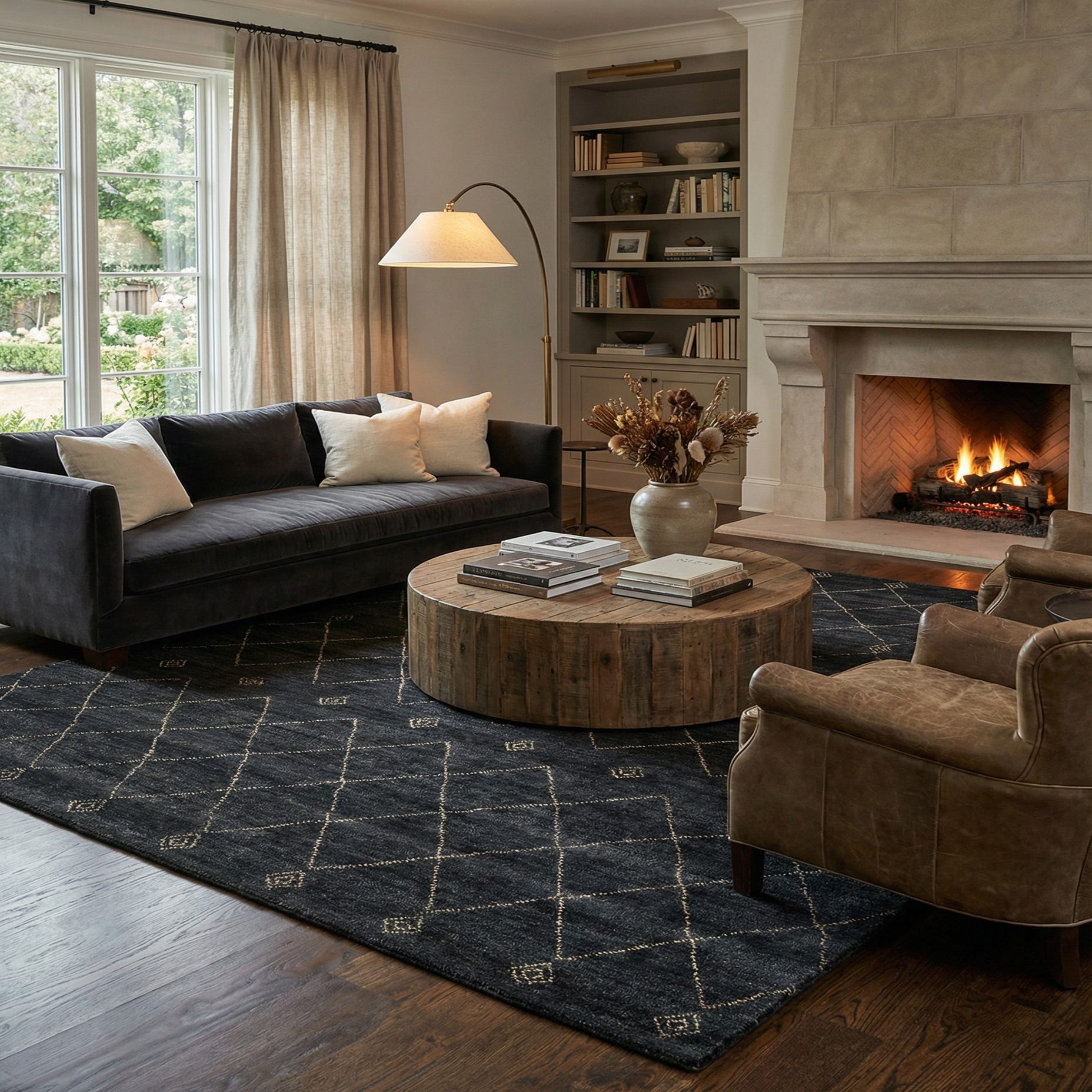 Primary color is Black. Colors in this rug include: Black, Ivory.