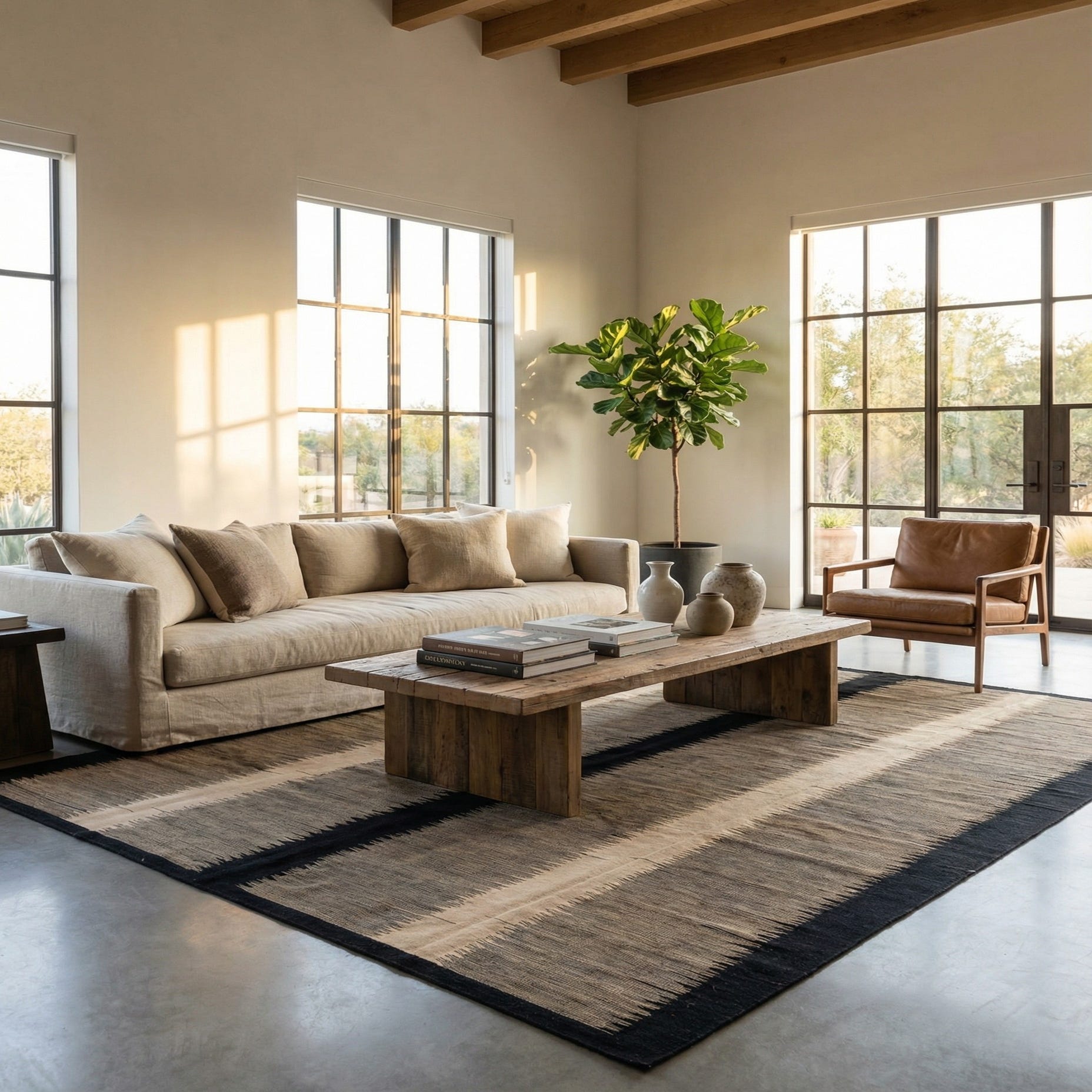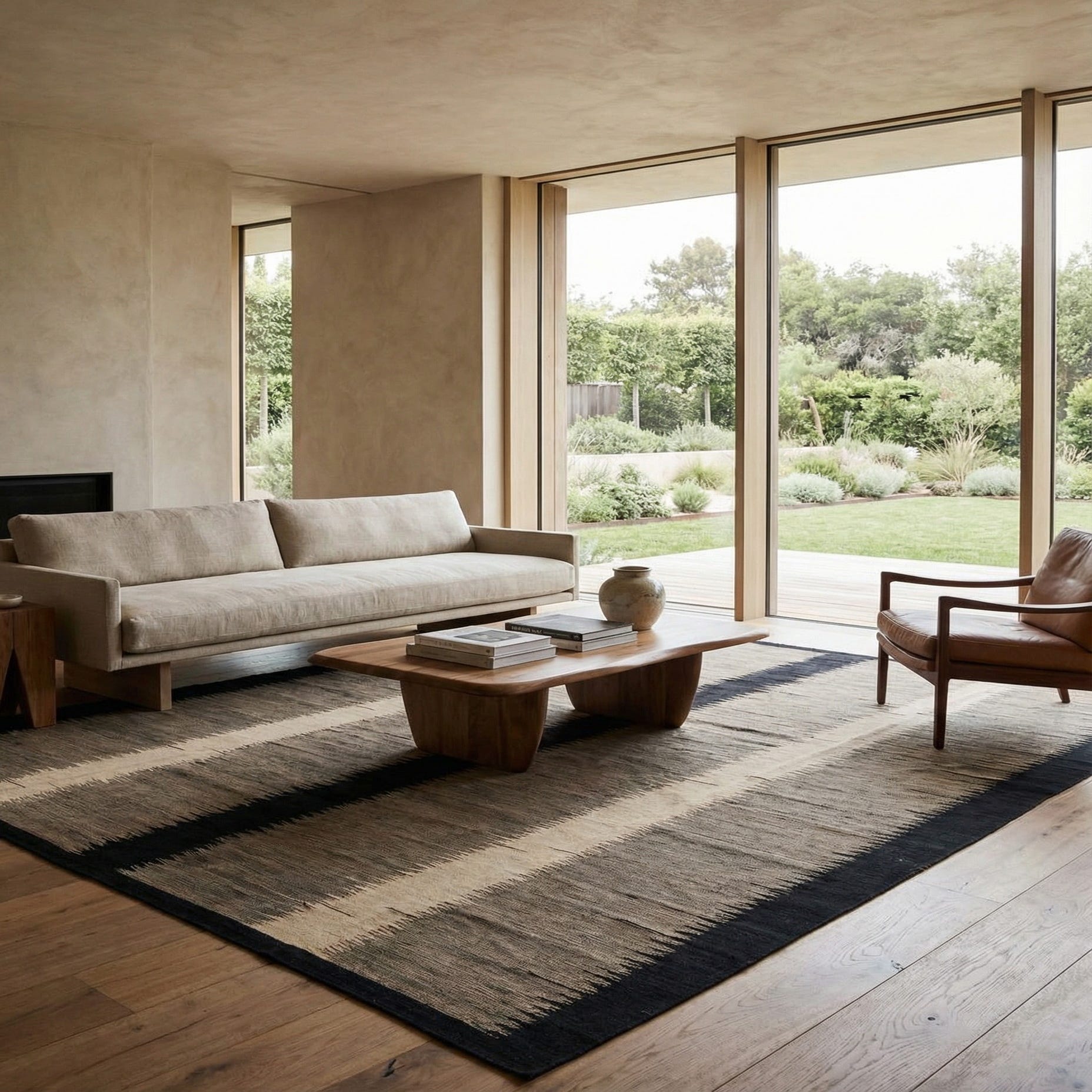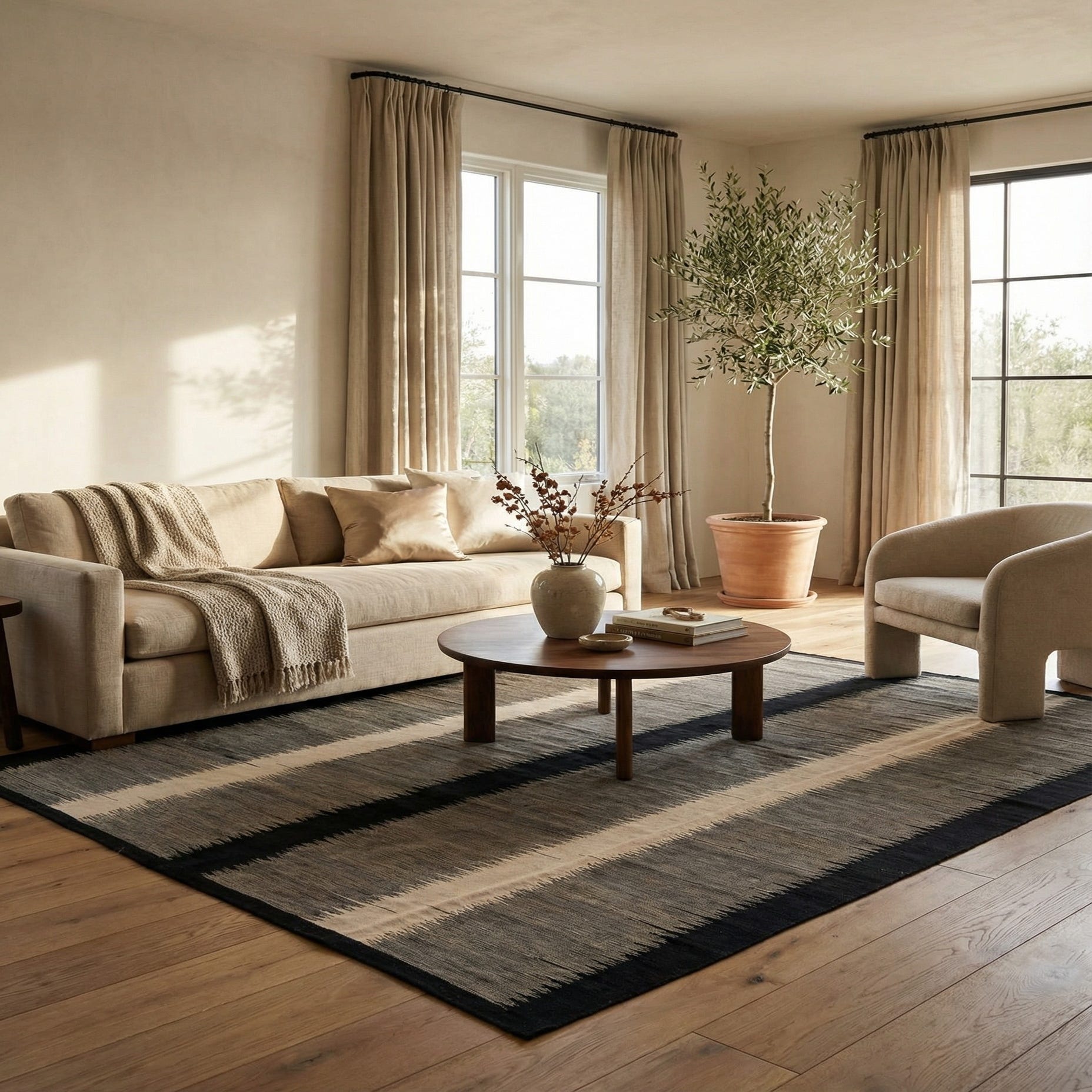 Primary color is Black. Colors in this rug include: Black, Ivory.