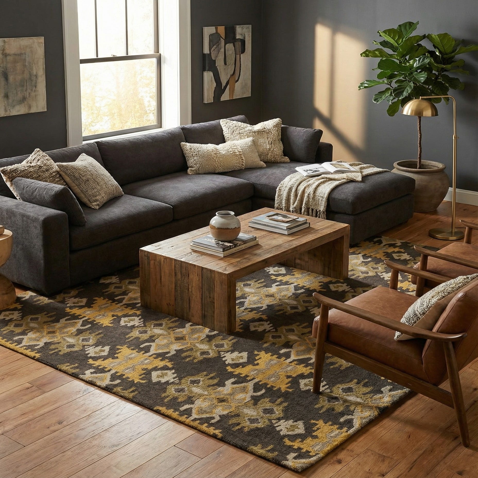 Primary color is Black. Colors in this rug include: Black, Ivory, Yellow, Gray, Olive.