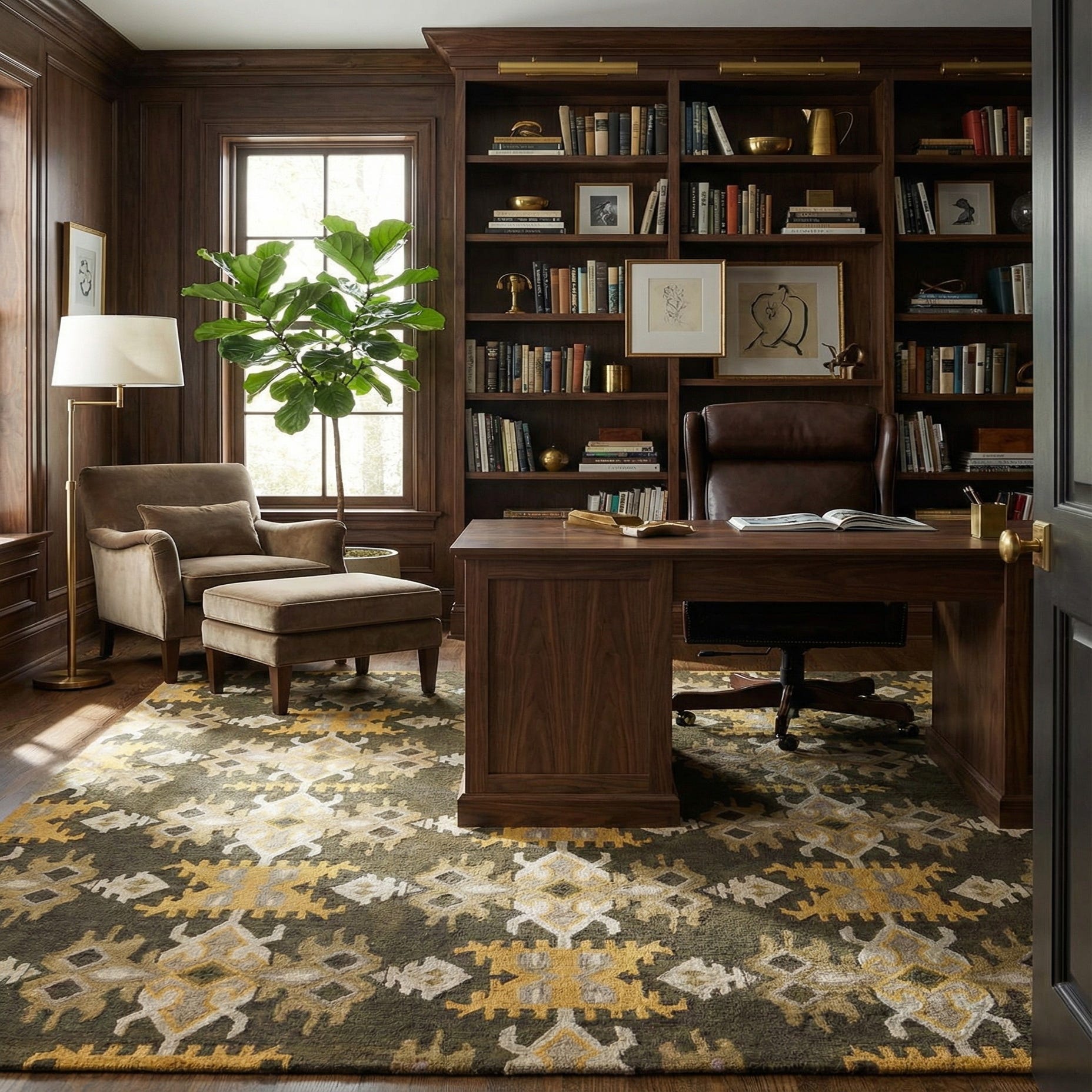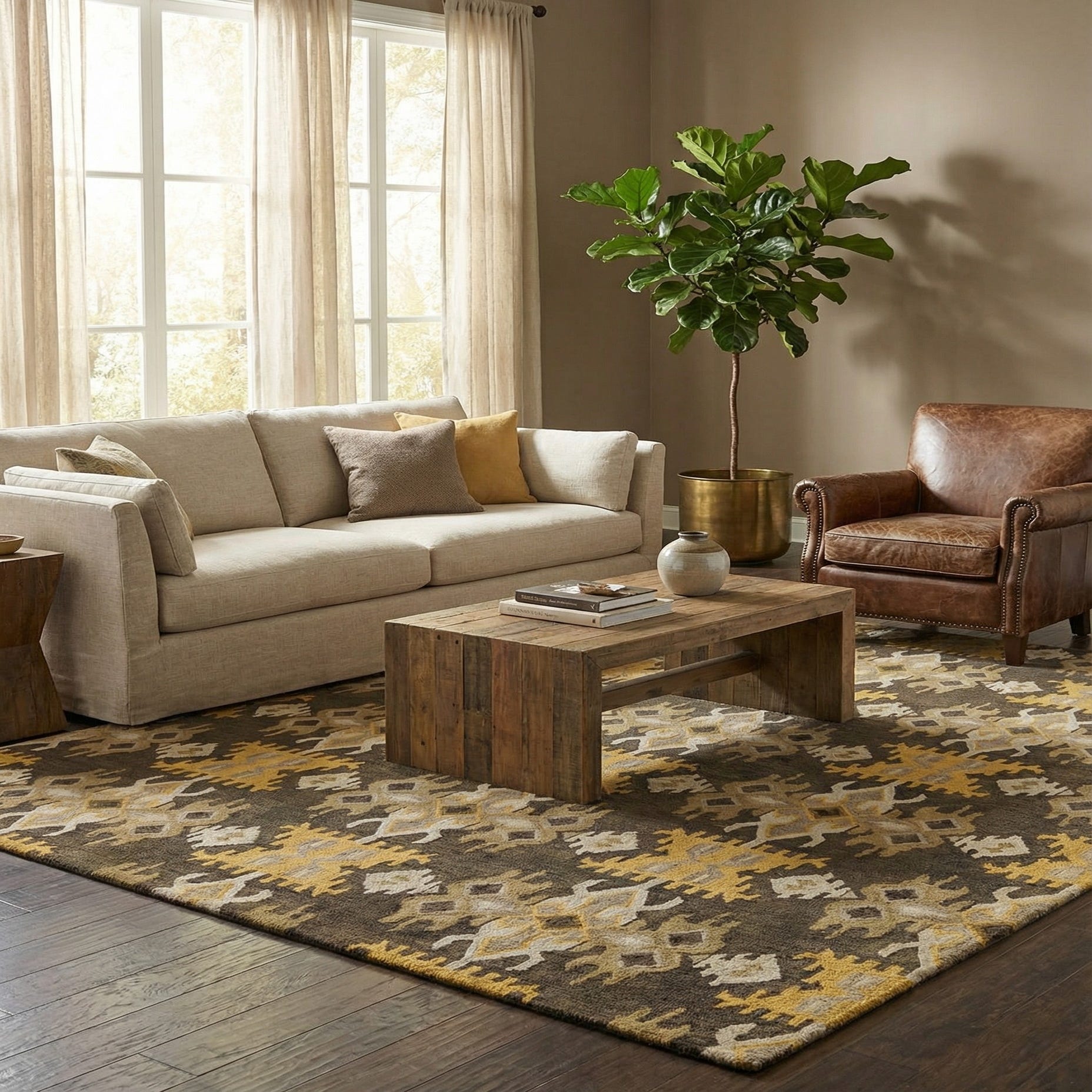 Primary color is Black. Colors in this rug include: Black, Gray, Light Brown, Ivory, Yellow, Olive.