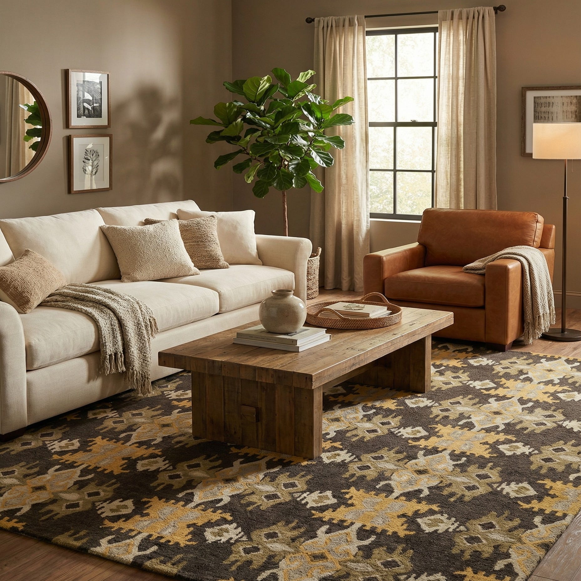 Primary color is Black. Colors in this rug include: Black, Ivory, Light Brown, Olive, Yellow, Gray, Light Blue.