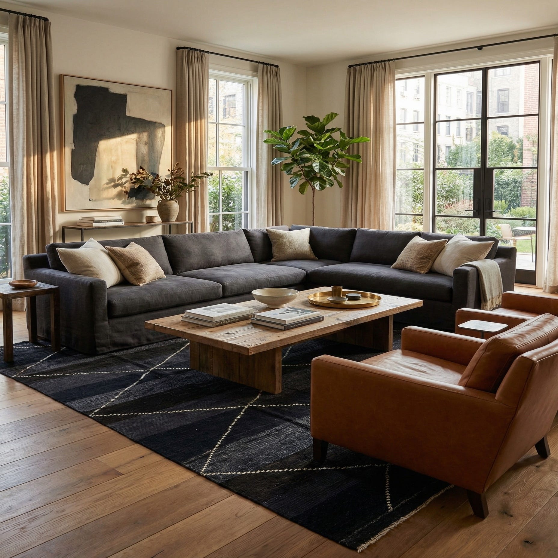 Primary color is Black. Colors in this rug include: Black, Brown, Ivory, Gray.