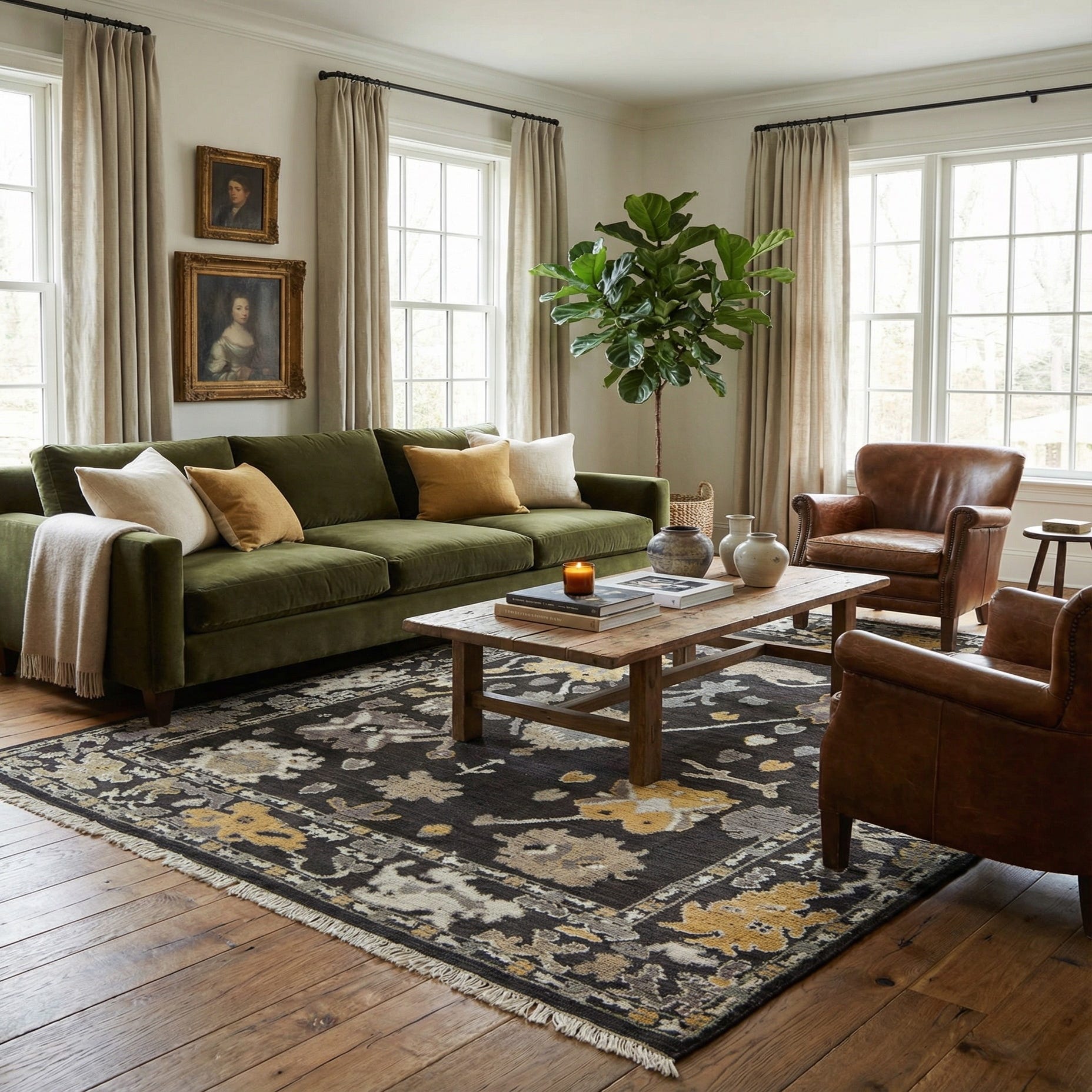 Primary color is Black. Colors in this rug include: Black, Gray, Ivory, Light Brown, Yellow.