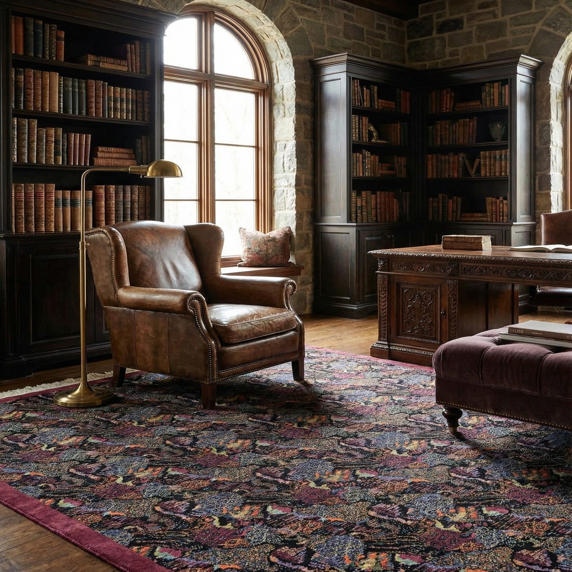 Primary color is Black. Colors in this rug include: Black, Beige, Blue, Brown, Green, Purple, Orange.