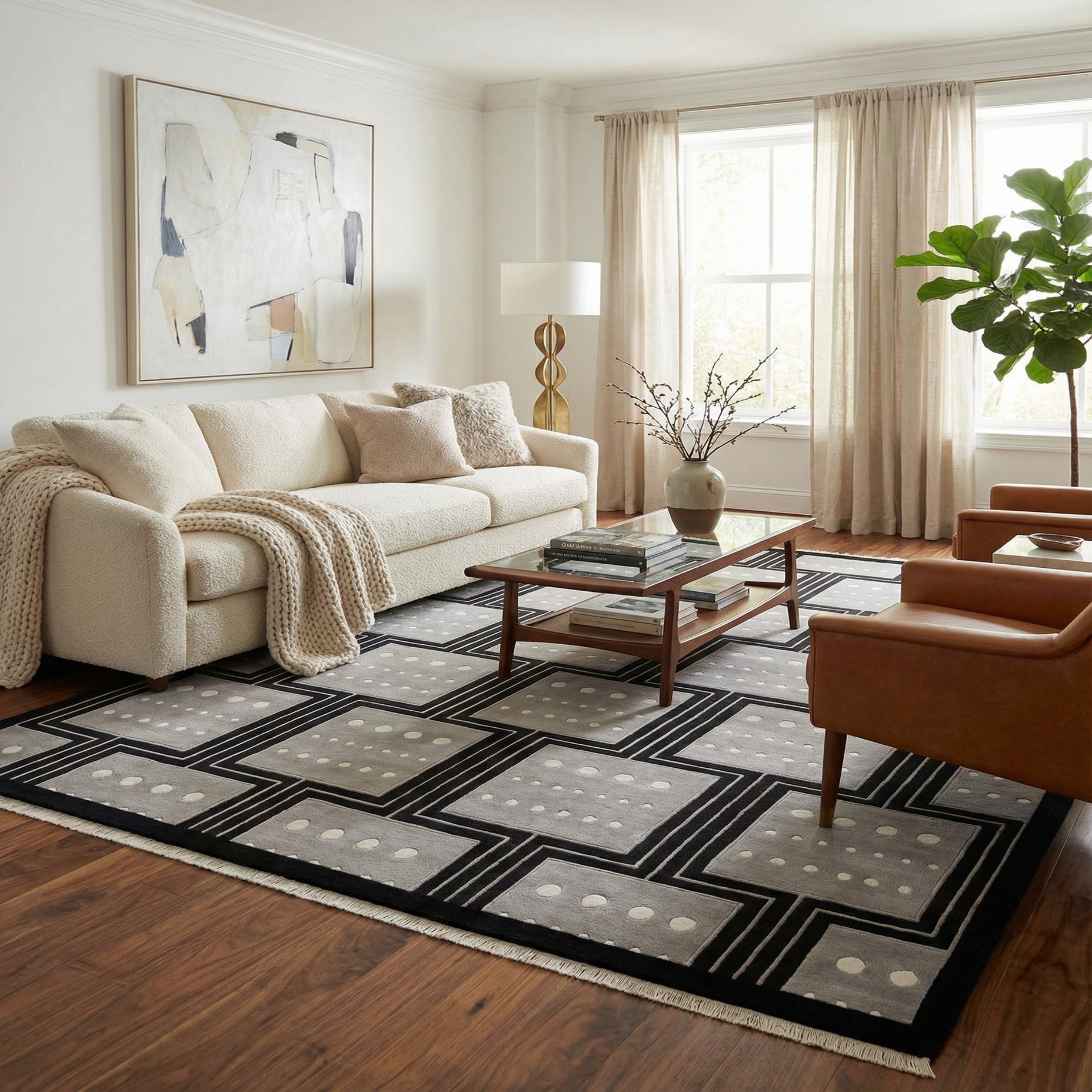 Primary color is Black. Colors in this rug include: Black, Gray, Silver.