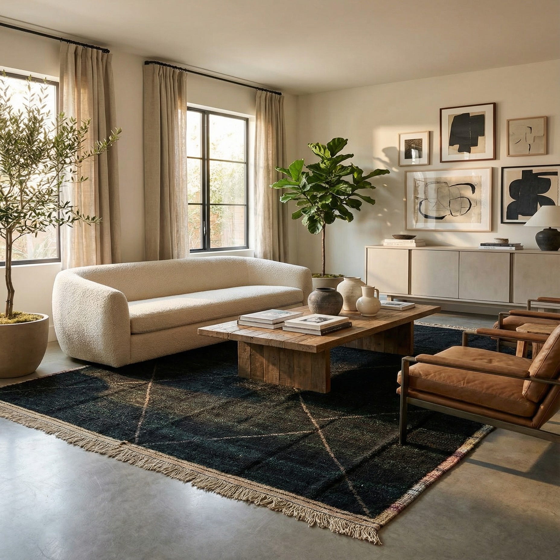 Primary color is Black. Colors in this rug include: Black, Hunter Green, Beige.