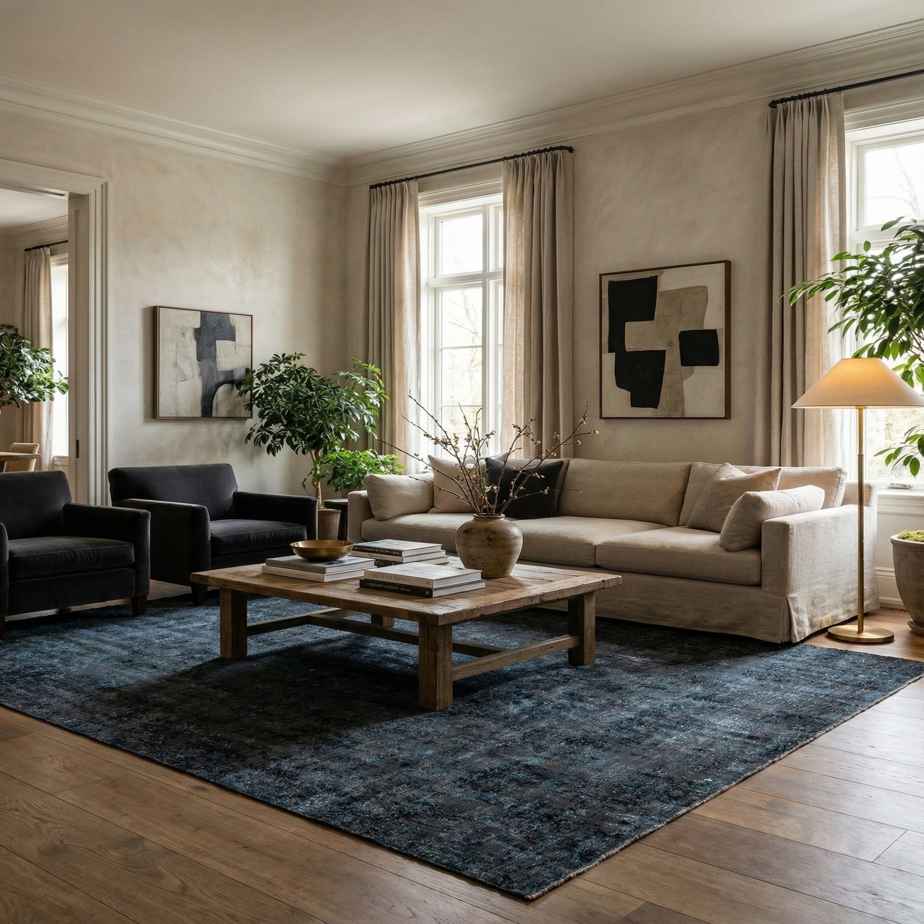 Primary color is Black. Colors in this rug include: Black, Ivory, Gray, Blue.