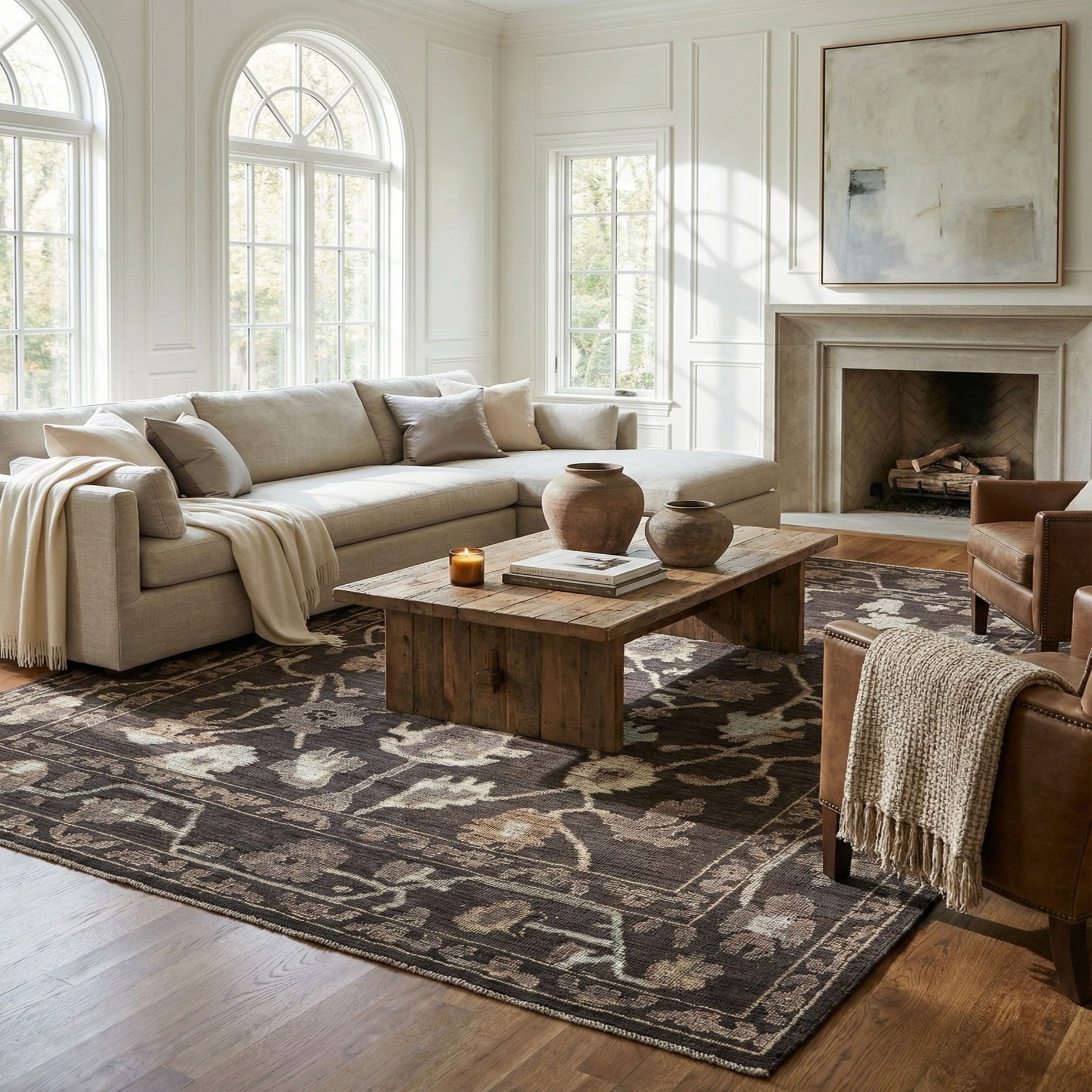 Primary color is Black. Colors in this rug include: Black, Beige, Brown, Light Blue, Light Brown, Ivory.